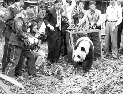 荊楚網消息(楚天都市報)一只野生大熊貓日前闖入四川省都江堰鬧市(本報曾予報道),被當地林業(yè)部門營救,并被送往臥龍自然保護區(qū)療養(yǎng)。8月8日,戴有GPS衛(wèi)星定位儀器的大熊貓被放歸都江堰龍溪虹口國家自然保護區(qū)。當天,它沒說拜拜就踏出鐵籠走入密林,前后不到10秒鐘。科研人員在今后一年多的時間內,將對它進行定位跟蹤,這有助于科學家進一步了解和掌握大熊貓野外生活習性和活動規(guī)律。(新華社發(fā))