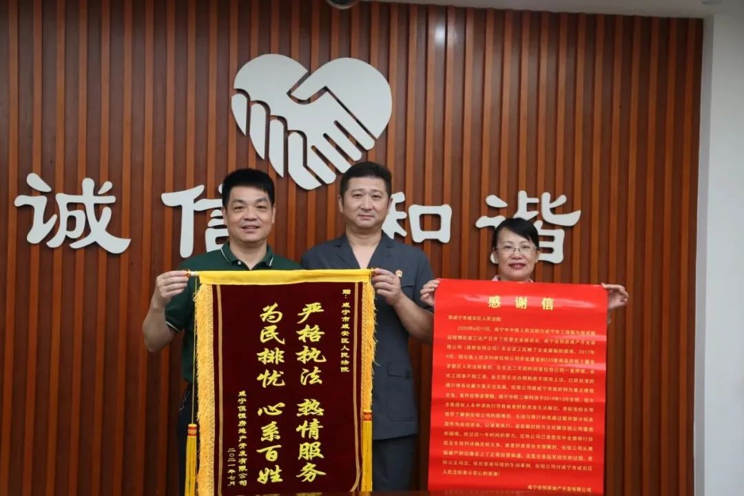 “感謝咸安區(qū)法院,讓我們公司從瀕臨破產(chǎn)的邊緣走回正常經(jīng)營的軌道,幫助我們起死回生......”7月16日下午,咸寧伍恒房地產(chǎn)開發(fā)有限公司(以下簡稱伍恒公司)負責(zé)人將一面寫有“嚴(yán)格執(zhí)法,熱情服務(wù);為民排憂,心系百姓”的錦旗和一封感謝信送至咸安區(qū)法院,感謝區(qū)法院執(zhí)行局善意文明執(zhí)行,幫助企業(yè)渡過難關(guān)。