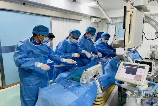 在完善各項(xiàng)術(shù)前檢查后,普外1科副主任陳加新,醫(yī)師柯章明、周義在華中科技大學(xué)同濟(jì)醫(yī)學(xué)院附屬協(xié)和醫(yī)院血管外科教授劉建勇的指導(dǎo)下,為患者成功施行了經(jīng)股動(dòng)脈置管腹主動(dòng)脈瘤覆膜支架置入術(shù)+右側(cè)髂動(dòng)脈栓塞術(shù)。