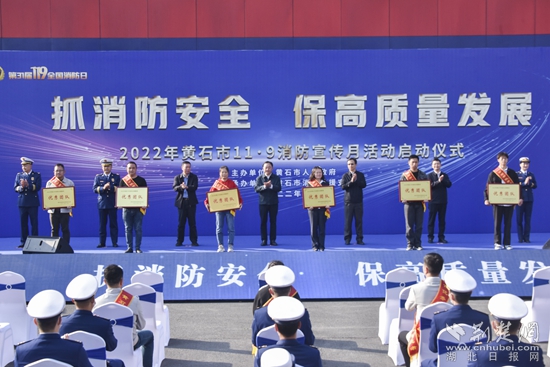 啟動儀式上,黃石市消防救援支隊支隊長程雄鷹部署了消防宣傳月相關(guān)工作,市委宣傳部副部長丁元拾宣讀了《關(guān)于表彰全市優(yōu)秀消防志愿服務(wù)團隊和消防宣傳志愿者的通報》,與會領(lǐng)導為獲獎團隊和個人代表頒發(fā)了獎牌及證書。