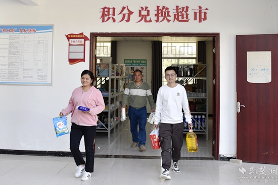 11月14日,馬港鎮(zhèn)彭段村民彭石梅在村“積分超市”兌付了一壺油兩袋米,他高興地說:“我們門前的路自己修、門前的清潔自己掃,還能上積分榜,兌付獎品?!?/p>