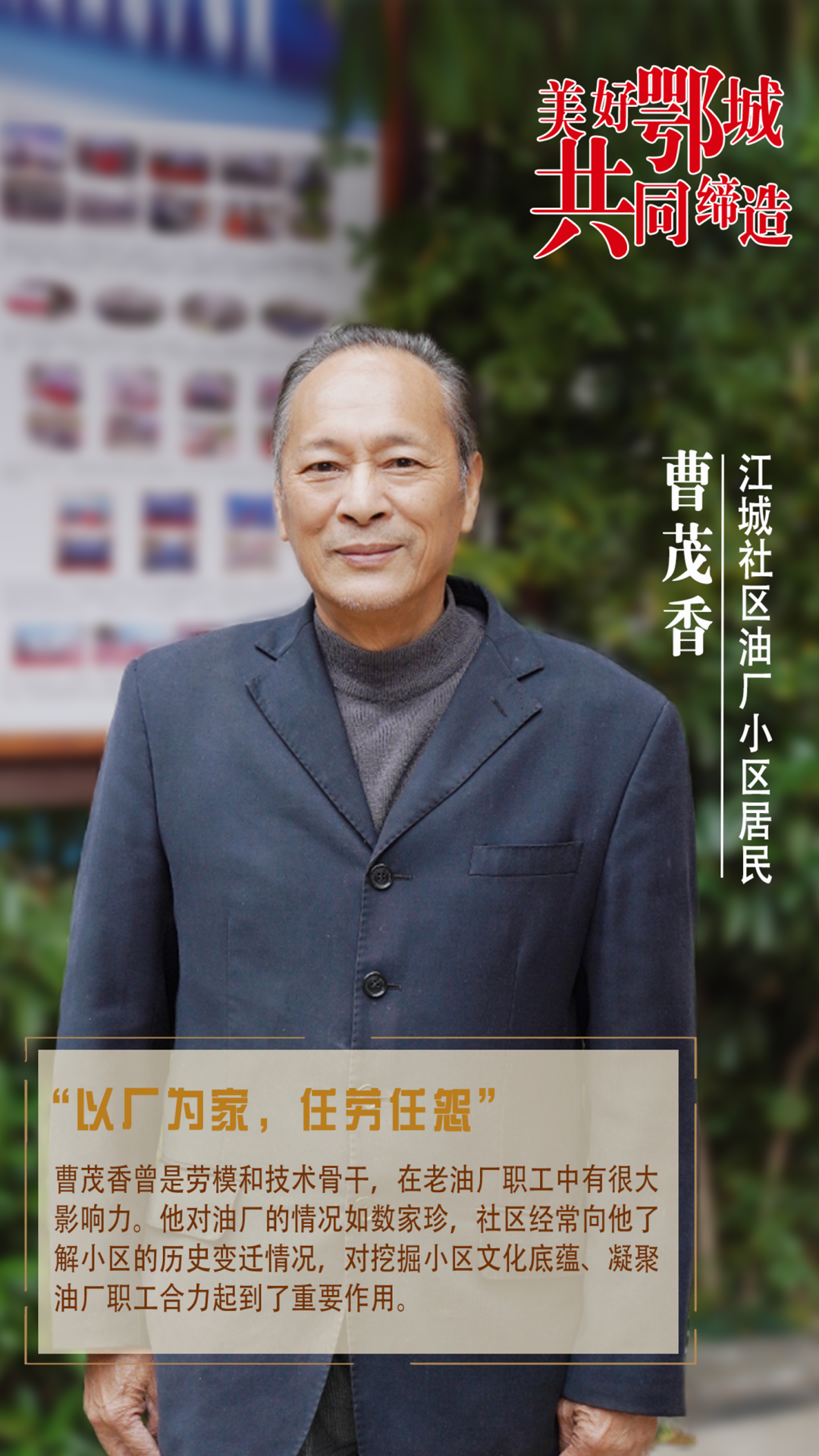 曹茂香曾是勞模和技術骨干,在老油廠職工中有很大影響力。他對油廠的情況如數(shù)家珍,社區(qū)經(jīng)常向他了解小區(qū)的歷史變遷情況,對挖掘小區(qū)文化底蘊、凝聚油廠職工合力起到了重要作用。