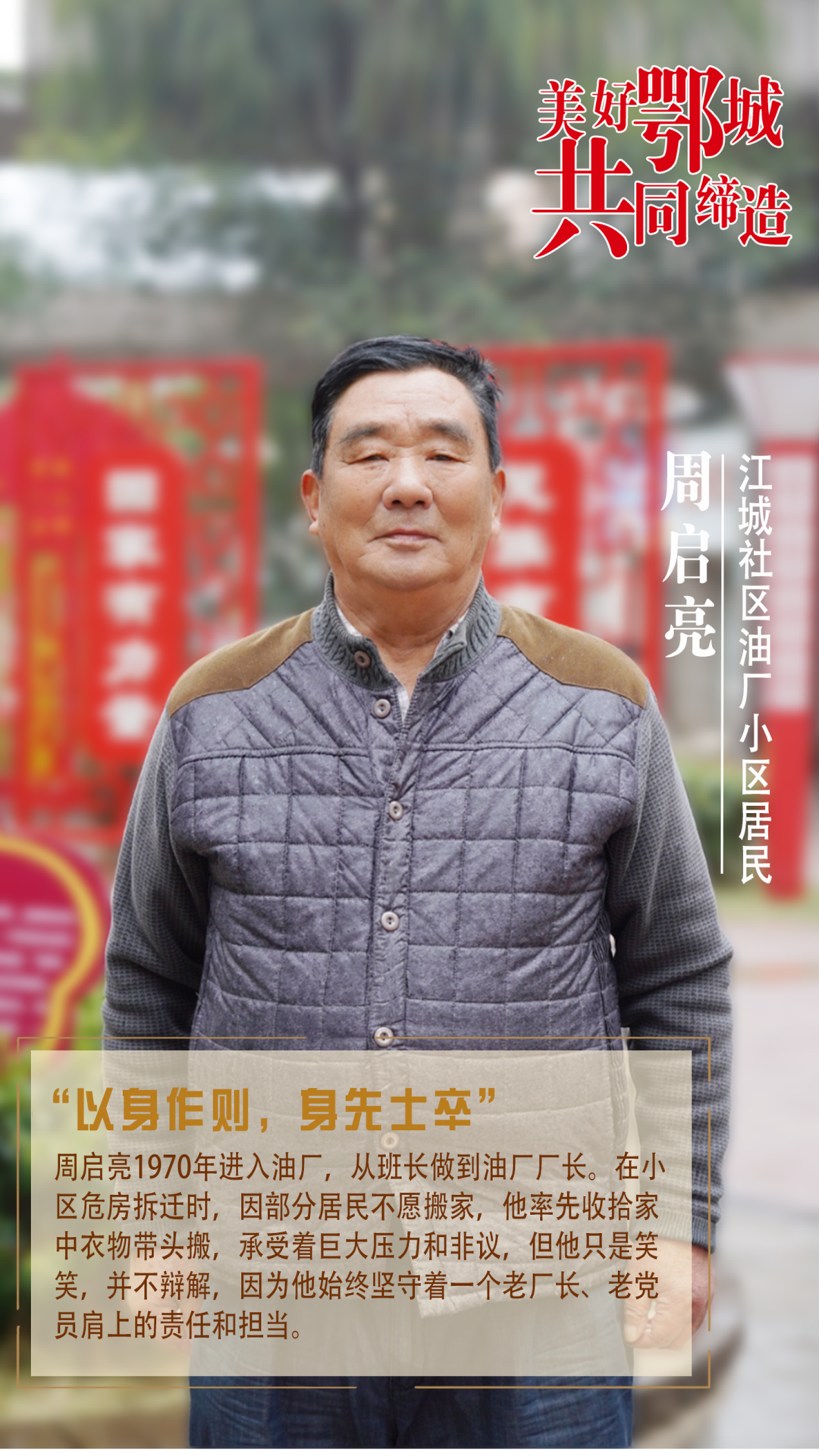 周啟亮1970年進入油廠,從班長做到油廠廠長。在小區(qū)危房拆遷時,因部分居民不愿搬家,他率先收拾家中衣物帶頭搬,承受著巨大壓力和非議,但他只是笑笑,并不辯解,因為他始終堅守著一個老廠長、老黨員肩上的責任和擔當。