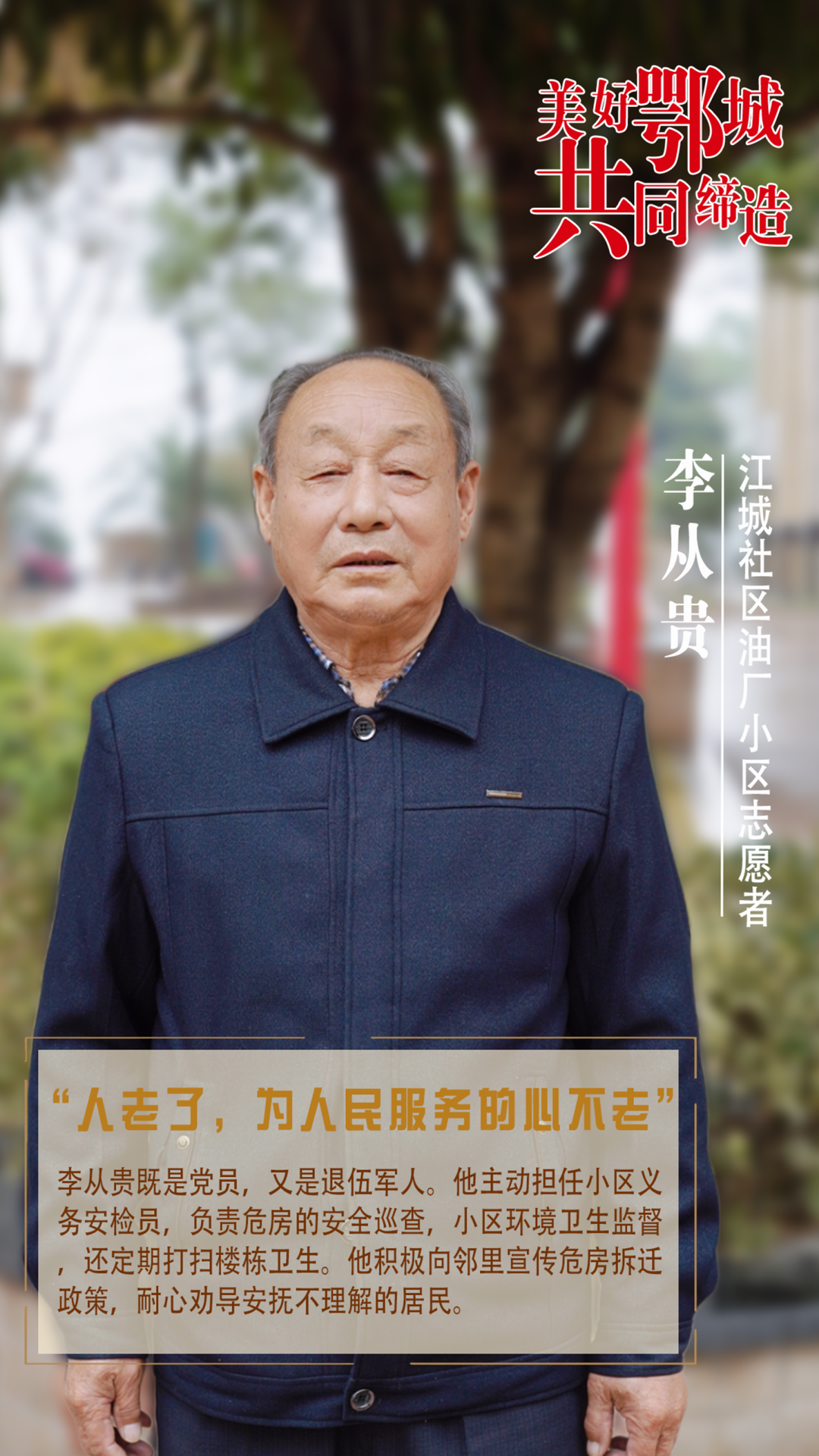 李從貴既是黨員,又是退伍軍人。他主動擔任小區(qū)義務安檢員,負責危房的安全巡查,小區(qū)環(huán)境衛(wèi)生監(jiān)督,還定期打掃樓棟衛(wèi)生。他積極向鄰里宣傳危房拆遷政策,耐心勸導安撫不理解的居民。