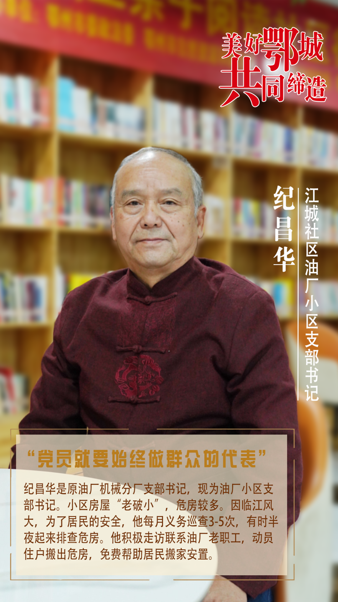 紀昌華是原油廠機械分廠支部書記,現(xiàn)為油廠小區(qū)支部書記。小區(qū)房屋“老破小”,危房較多。因臨江風大,為了居民的安全,他每月義務巡查3-5次,有時半夜起來排查危房。他積極走訪聯(lián)系油廠老職工,動員住戶搬出危房,免費幫助居民搬家安置。