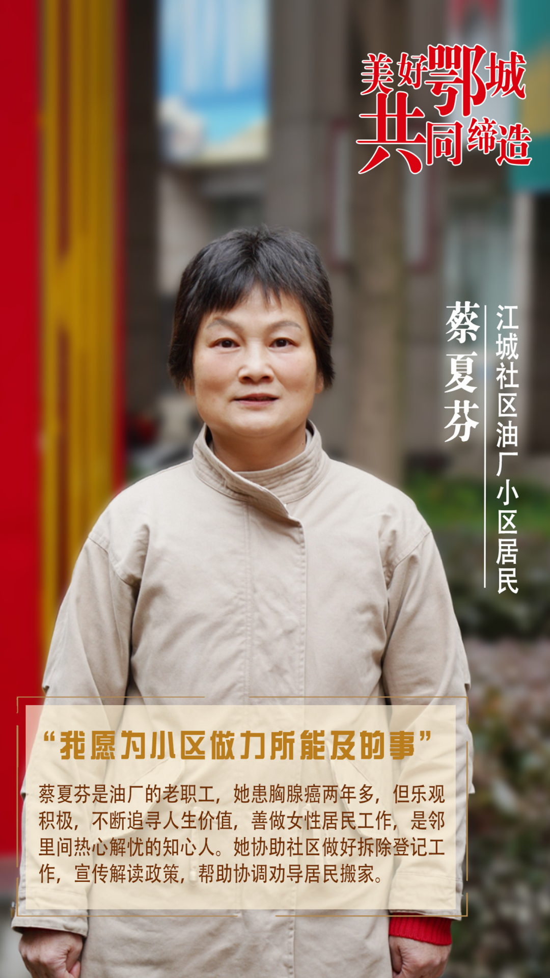 蔡夏芬是油廠的老職工,她患胸腺癌兩年多,但樂觀積極,不斷追尋人生價值,善做女性居民工作,是鄰里間熱心解憂的知心人。她協(xié)助社區(qū)做好拆除登記工作,宣傳解讀政策,幫助協(xié)調勸導居民搬家。