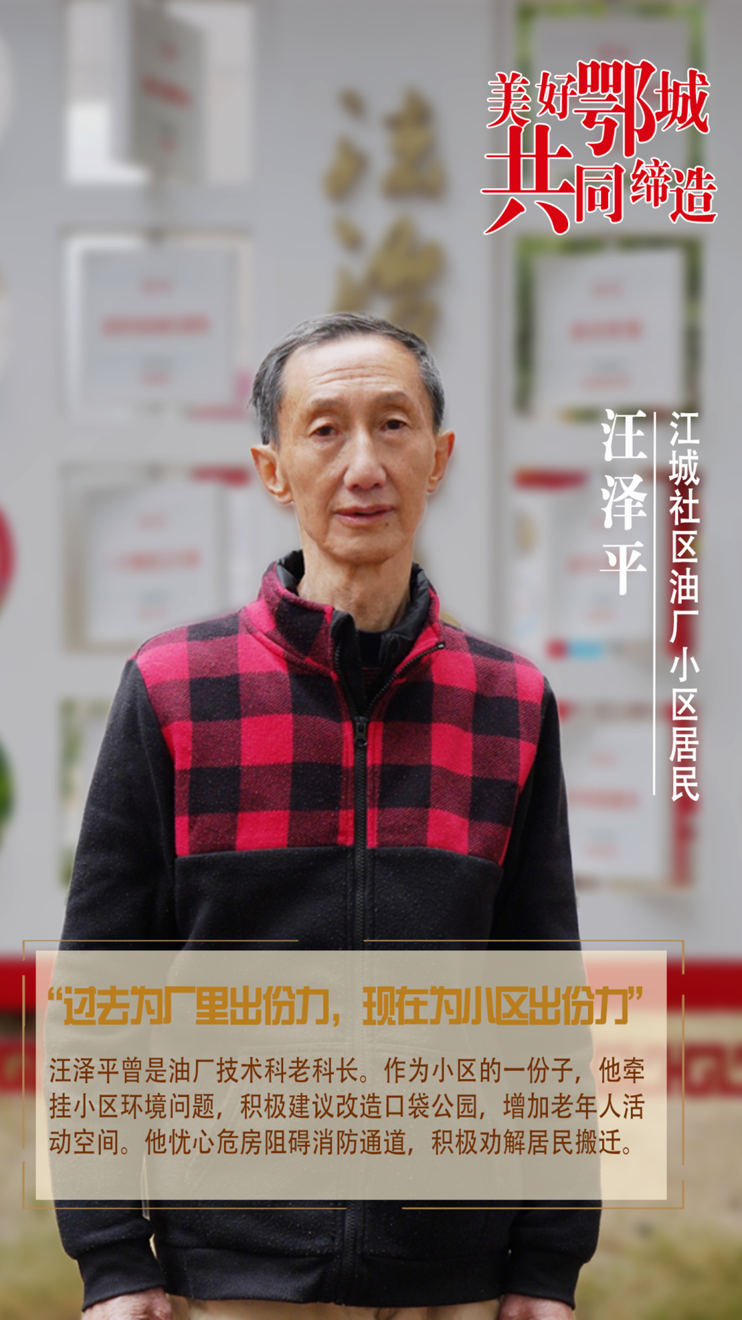 汪澤平曾是油廠技術科老科長。作為小區(qū)的一份子,他牽掛小區(qū)環(huán)境問題,積極建議改造口袋公園,增加老年人活動空間。他憂心危房阻礙消防通道,積極勸解居民搬遷。