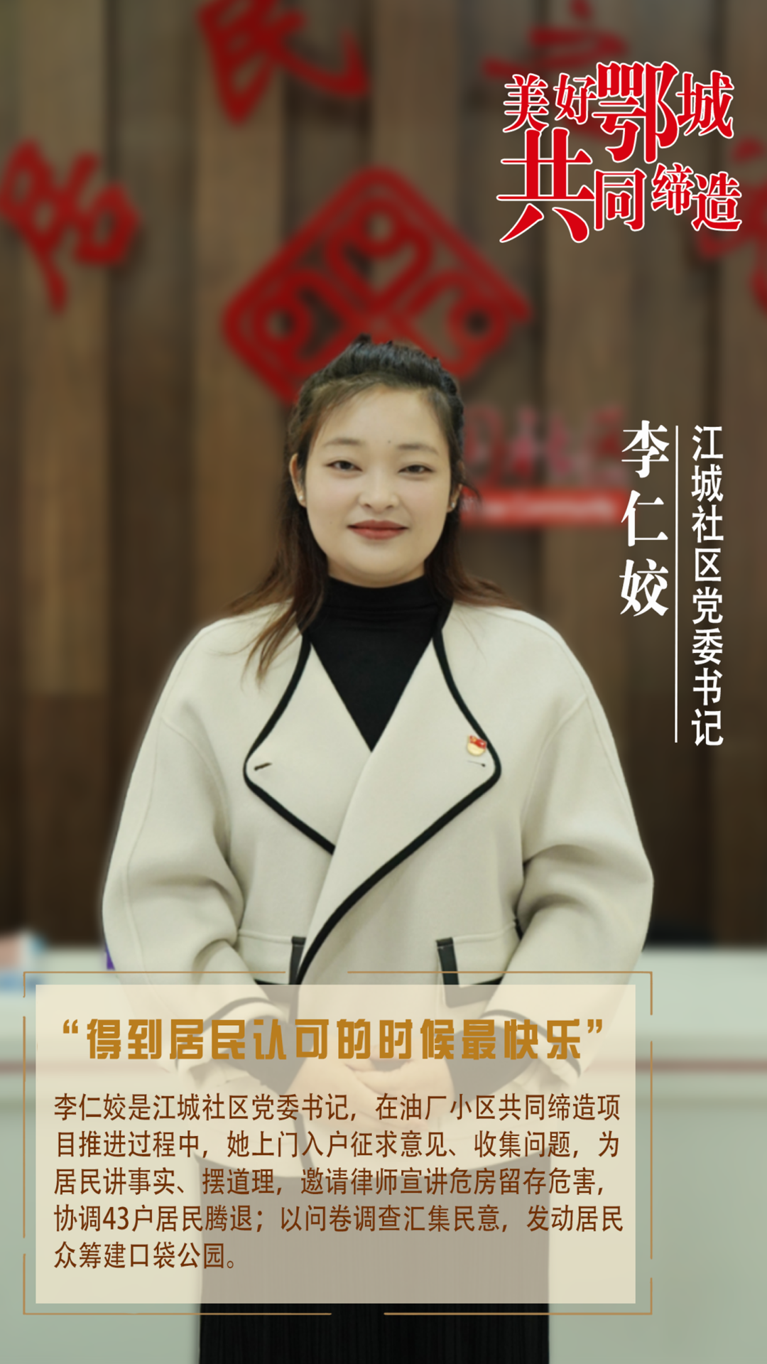 李仁姣是江城社區(qū)黨委書記,在油廠小區(qū)共同締造項目推進過程中,她上門入戶征求意見、收集問題,為居民講事實、擺道理,邀請律師宣講危房留存危害,協(xié)調43戶居民騰退;以問卷調查匯集民意,發(fā)動居民眾籌建口袋公園。