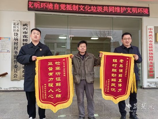 荊楚網(wǎng)(湖北日?qǐng)?bào)網(wǎng))訊(通訊員 耿文輝 趙兆)“老兵調(diào)解真得力,鎮(zhèn)村聯(lián)動(dòng)解民憂”“檢察聽(tīng)證解心結(jié),監(jiān)督有力暖人心”,12月27日,信訪戶董某甲將兩面錦旗分別送給武穴市人民檢察院和武穴市花橋鎮(zhèn)饒垴村綜治中心。