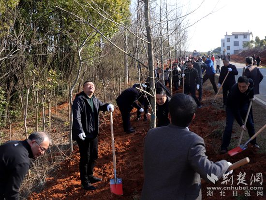 2月27日,在S360省道官埠段,春日暖陽,綠意盎然。咸寧市和咸安區(qū)200余名黨員干部正在揮揪植樹,1300棵株樹、香楓、紅櫸立馬成行,夾道迎賓。干群熱火朝天的干勁,恰似春風撲面。