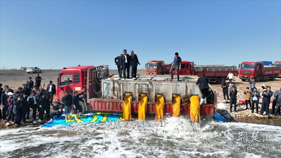 活動現(xiàn)場,一輛輛滿載魚苗的大型貨車有序駛向江邊,工作人員爬上車,用撈魚網(wǎng)舀起魚苗認(rèn)真察看,隨后打開裝魚苗的容器,不同種類的魚苗沿著放置的斜面傾瀉,伴著晶瑩的水花,四散游向更遠(yuǎn)處。