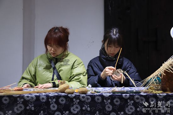 在演出現(xiàn)場旁的鄉(xiāng)村記憶館內,馬橋油畫風景寫生展、鄂南雕花剪紙作品展同時吸引著游人的目光。來自湖北科技學院的學生正在展廳中編織特色竹制品,繪制富有當?shù)孛袼滋攸c的文創(chuàng)作品。