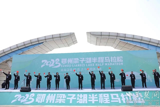 活動(dòng)現(xiàn)場(chǎng),中共鄂州市委書記孫兵,湖北省體育局二級(jí)巡視員胡晶珊,鄂州市人大副主任周秀華,鄂州市委常委、宣傳部部長(zhǎng)鄒霞,鄂州市委常委、副市長(zhǎng)盧輝,鄂州市副市長(zhǎng)、公安局長(zhǎng)方勇,鄂州市副市長(zhǎng)邱實(shí),鄂州市政府黨組成員李梁軍共同為比賽鳴槍發(fā)令。一聲整齊的發(fā)令槍聲響徹云霄,打響了2023鄂州梁子湖半程馬拉松起跑的號(hào)角。