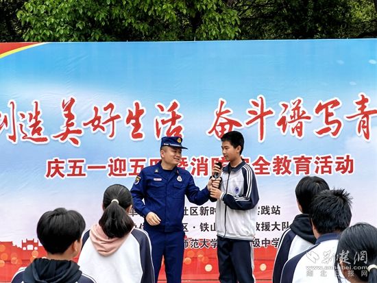 在消防小知識有獎競答環(huán)節(jié),學生們踴躍回答問題,紛紛展示學到的消防知識,現(xiàn)場氣氛一片火熱,為了增強互動效果,宣傳員利用消防宣傳車播放了生動有趣的消防安全知識短片,并講解了滅火器、逃生面罩等消防器材及產(chǎn)品的使用方法和注意事項,吸引了學生們觀看和學習。