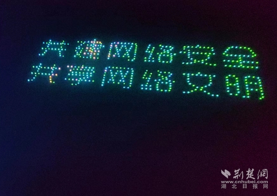 夜空中,數(shù)百架無(wú)人機(jī)以天空為畫布、以光影為畫筆,描繪出一幅幅科技與視覺的“大片”。表演融入網(wǎng)絡(luò)視聽元素和黃石、湖北地標(biāo)內(nèi)容,依次幻化成小燕子、天空之城、黃石歡迎你、地球、安全盾牌等11個(gè)畫面,最終匯集成“共建網(wǎng)絡(luò)安全 共享網(wǎng)絡(luò)文明”的字樣。