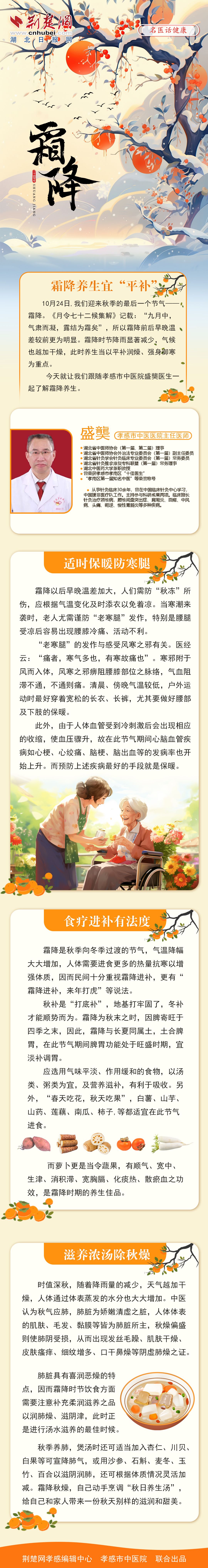 10月24日,我們迎來秋季的最后一個節(jié)氣一一霜降?!对铝钇呤蚣狻酚涊d:“九月中,氣肅而凝,露結(jié)為霜矣”,所以霜降前后早晚溫差較前更為明顯。霜降時節(jié)降雨顯著減少,氣候也越加干燥,此時養(yǎng)生當(dāng)以平補潤燥、強身御寒為重點。今天就讓我們跟隨孝感市中醫(yī)院盛龑醫(yī)生一起了解霜降養(yǎng)生。