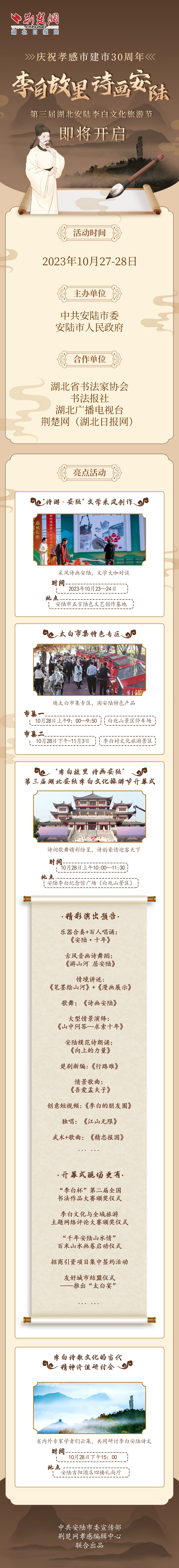 荊楚網(wǎng)(湖北日?qǐng)?bào)網(wǎng))訊(記者黃菲 通訊員劉壯)又是一年銀杏黃,涢城處處飄墨香。“李白故里,詩(shī)畫安陸”——慶祝孝感市建市30周年暨第三屆湖北安陸李白文化旅游節(jié)將于10月28日盛大開(kāi)幕。本屆李白文化旅游節(jié)有哪些精彩亮點(diǎn)呢?一起來(lái)看看!