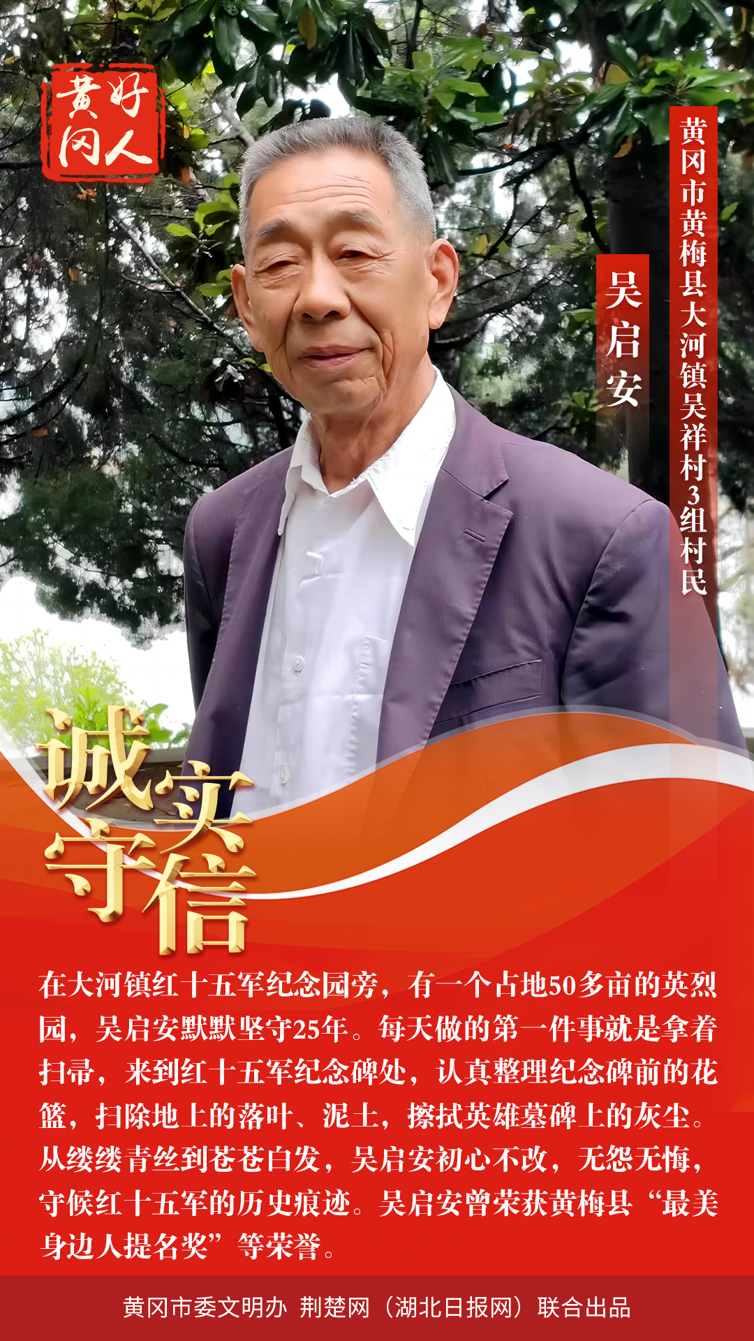 本期“黃岡好人”共有5組好人入選。他們中有“敬業(yè)奉獻,扎根商海40余載”的樊漢明;有“默默堅守25年,義務(wù)管理紅十五軍紀念園”的吳啟安;有“孝老愛親,被譽為大山里‘好兒媳’”的王志珍;有“見義勇為,先后5次救起落水群眾”的王臘;有“誠實守信,熱心勸學建書屋”的畢紅平。
