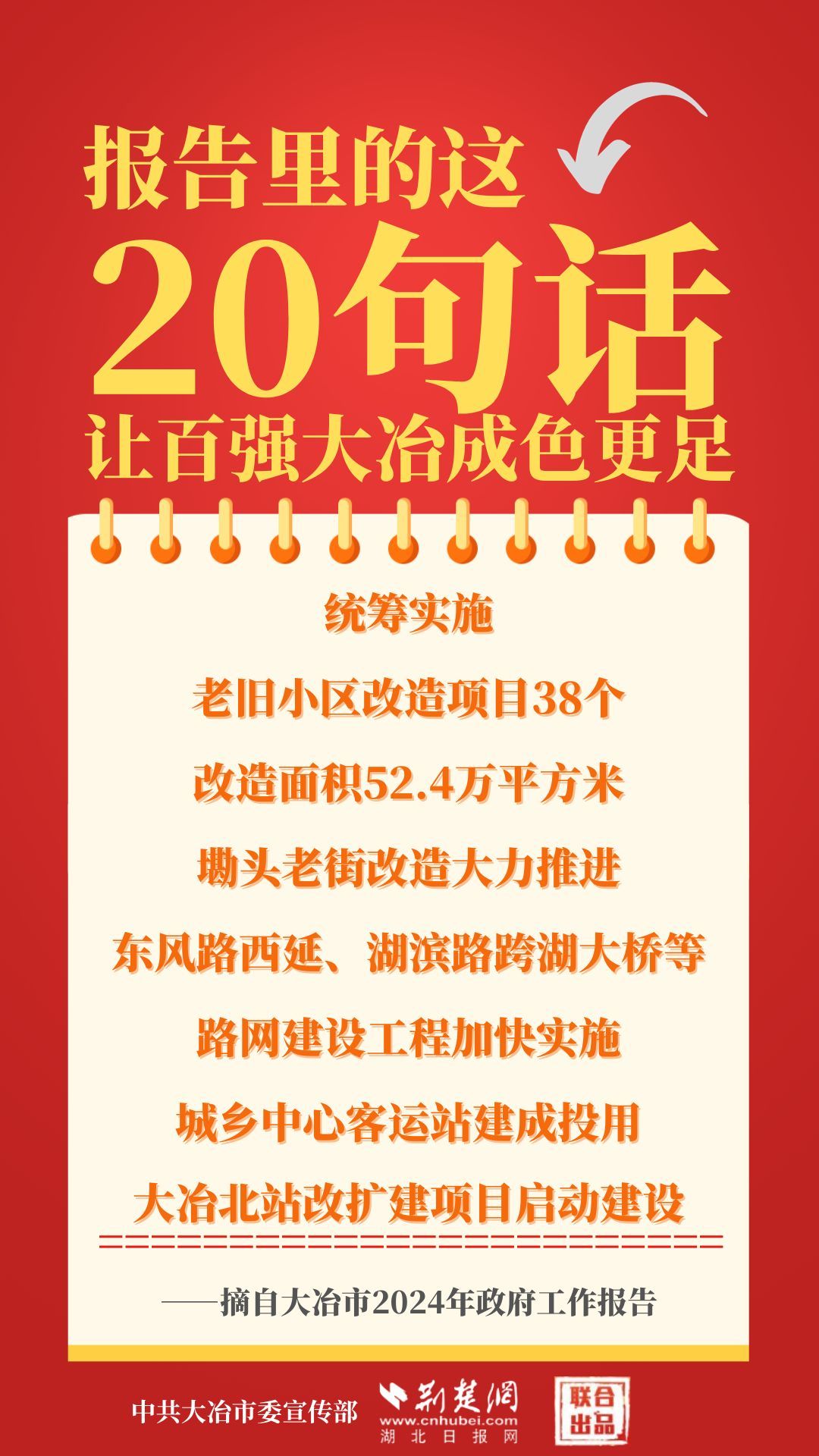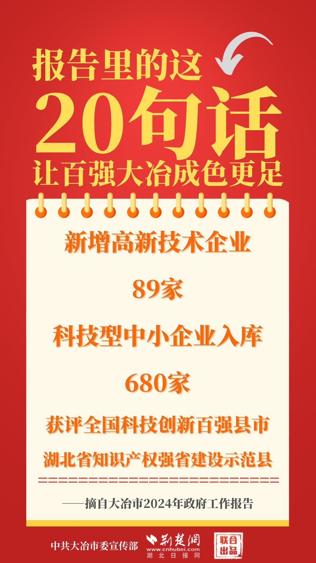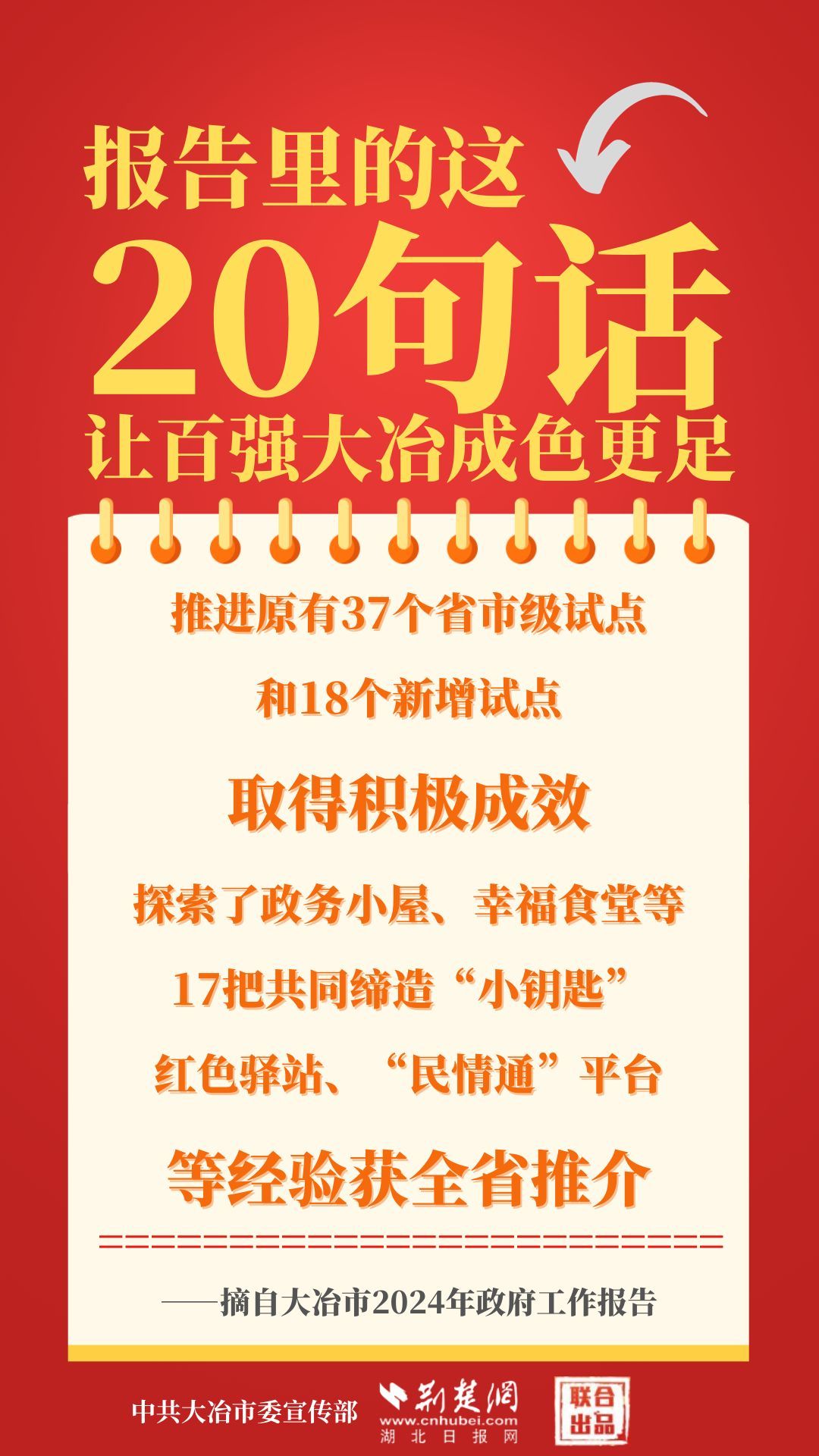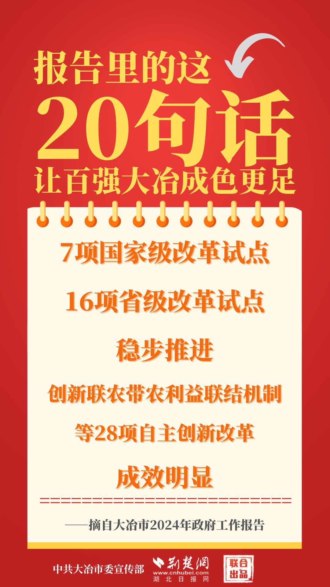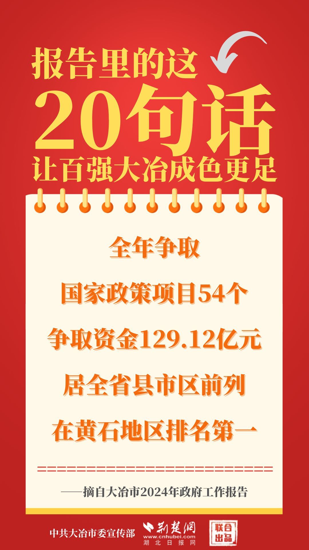 1月12日,大冶市第七屆人民代表大會(huì)第四次會(huì)議開幕,大冶市委副書記、市長(zhǎng)孫輒作政府工作報(bào)告。報(bào)告里的這20句話,讓百強(qiáng)大冶成色更足。