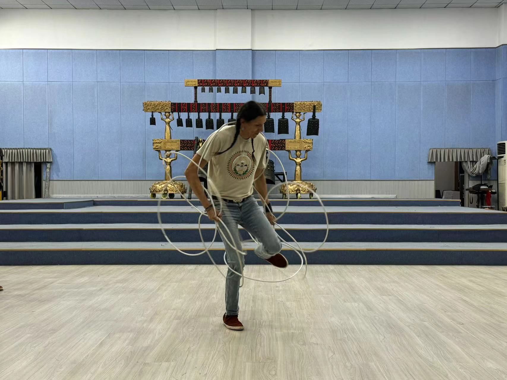 活動最后,Sihasin樂隊不僅帶來了極具迪內(nèi)納瓦霍特色的歌舞表演,還邀請現(xiàn)場所有演員上臺進行即興創(chuàng)作。大家圍成一個圓,悠揚的琴聲與貝斯聲完美融合,歌聲此起彼伏,中美音樂文化的交融將現(xiàn)場的氣氛推向了高潮。
