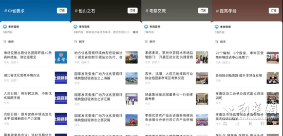 “孝納百川”欄目有4個專區(qū),分別為:“中省要求”,主要展示營商環(huán)境條例和國家、省、市發(fā)布的營商環(huán)境指導意見、工作方案等文件;“他山之石”,主要展示國家級改革試點事項、做法,國內各地營商環(huán)境特色亮點工作以及營商世界等微信公眾號發(fā)布的最新訊息等;“考察交流”,主要展示各地各部門外出考察和外地赴孝南考察交流的有關動態(tài);“提高孝能”,主要展示全區(qū)營商環(huán)境培訓工作。