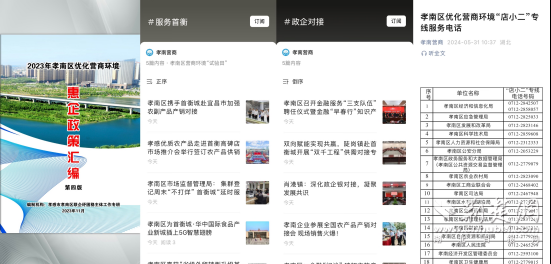 最后一個欄目“孝親熱線”有4個專區(qū),分別為:“部門熱線”,主要展示區(qū)直各部門“店小二”熱線電話和營商環(huán)境投訴舉報電話等;“政企對接”,主要展示區(qū)內“政銀企對接”“政企早餐會、午茶會”“一點三員”“聯(lián)企舒困”等活動開展情況;“服務首衡”,主要展示“頭號工程”和“一號工程”的“雙向奔赴”,即各地各部門服務首衡城工作情況;“惠企政策”,主要展示的是孝南區(qū)的各項惠企惠民政策。