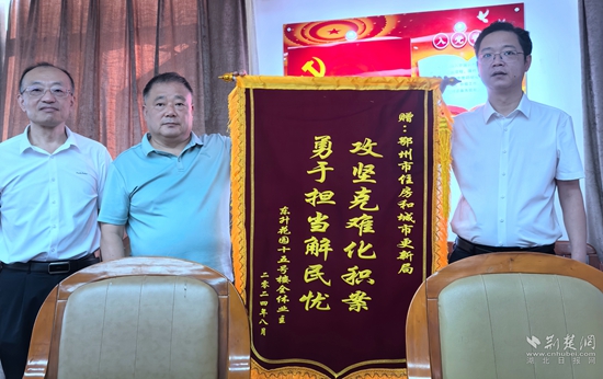 荊楚網(湖北日報網)訊(記者王焱堯)攻堅克難化積案,勇于擔當解民憂。8月30日上午,鄂州市東升花園小區(qū)15號樓業(yè)主代表周克東、胡德江給鄂州市住更局送去一面錦旗。