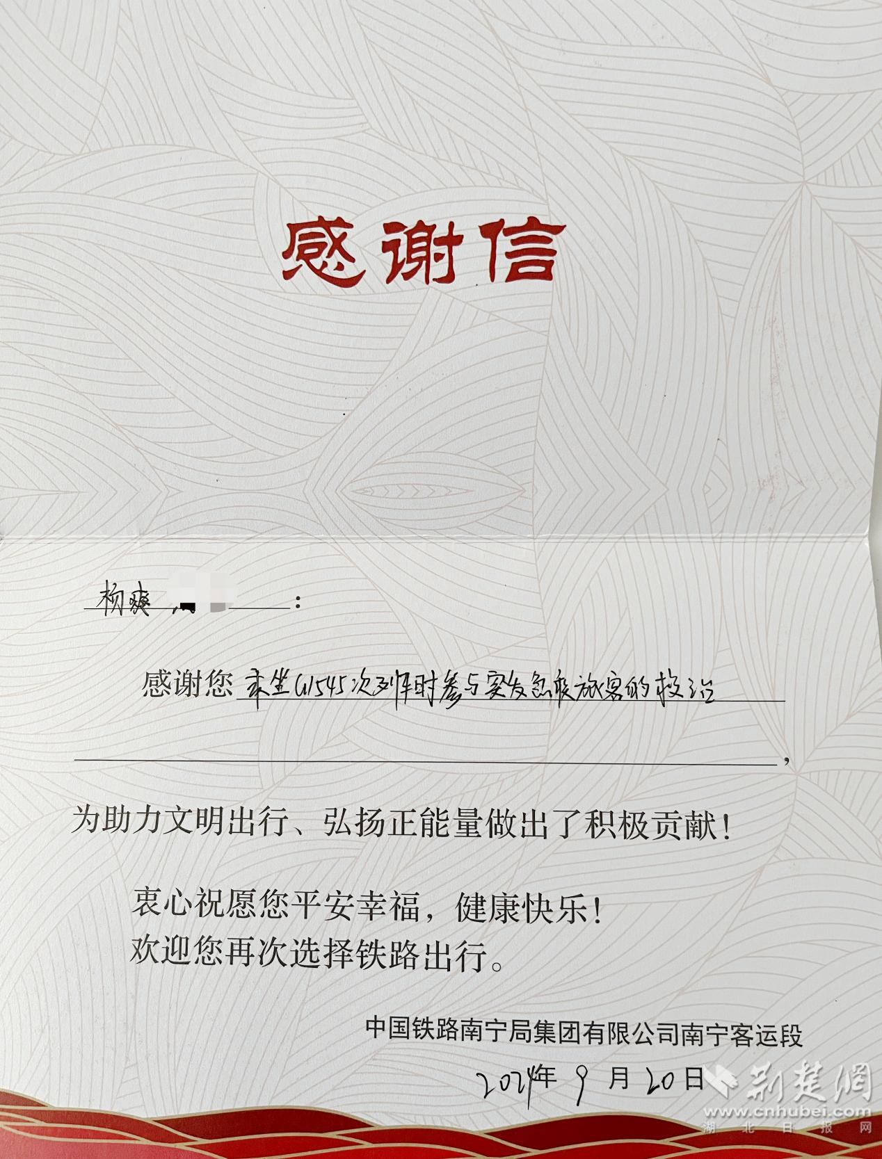 荊楚網(wǎng)(湖北日報(bào)網(wǎng))訊(記者葉修頎 通訊員羅津)10月19日,孝感市中心醫(yī)院骨科Ⅱ脊柱病區(qū)醫(yī)生楊爽收到了一份特殊的禮物——一封來自中國鐵路南寧局集團(tuán)有限公司南寧客運(yùn)段的感謝信以及一款“鐵潮”文創(chuàng)背包,以感謝他的一次緊急救助行動。