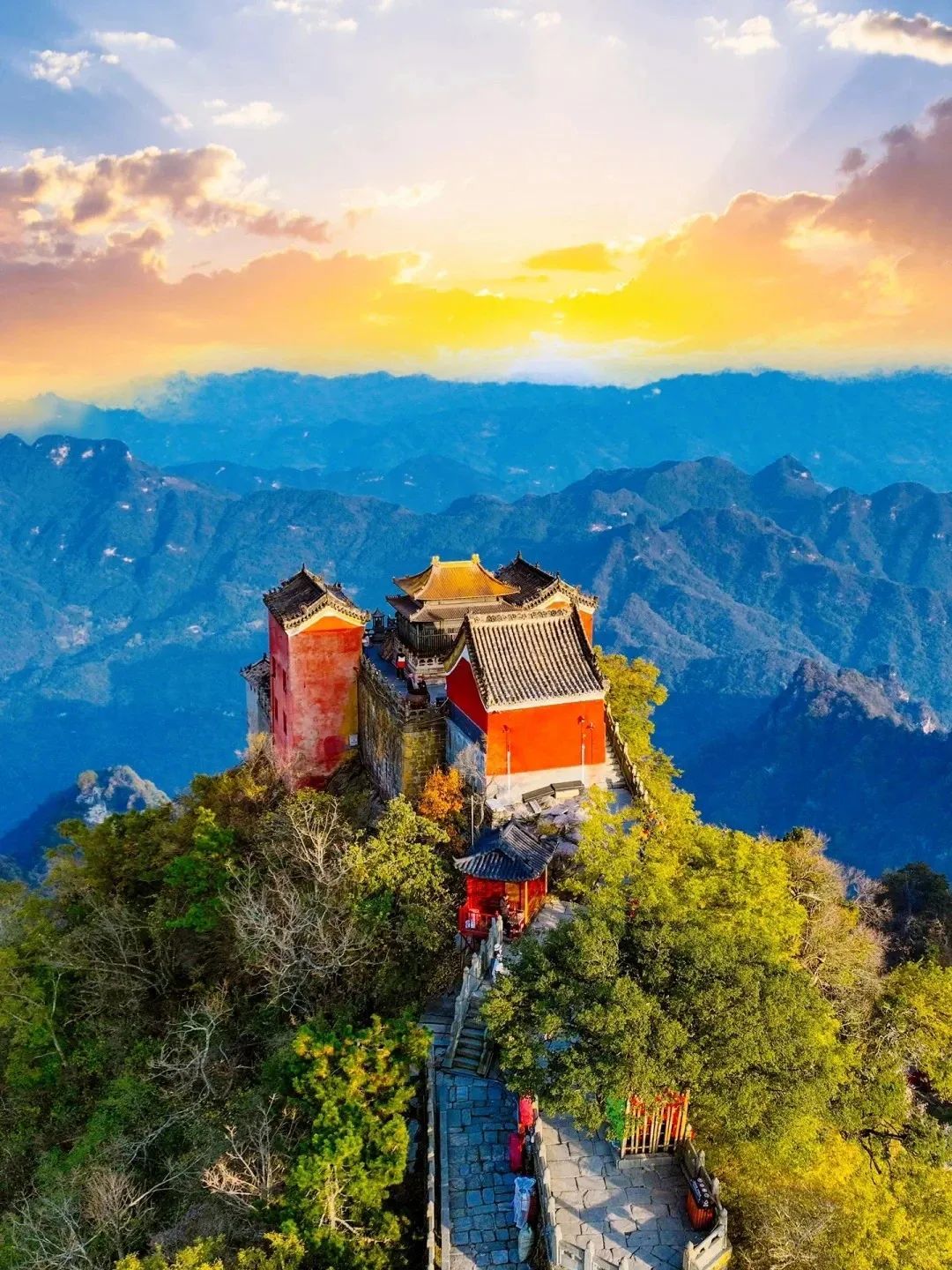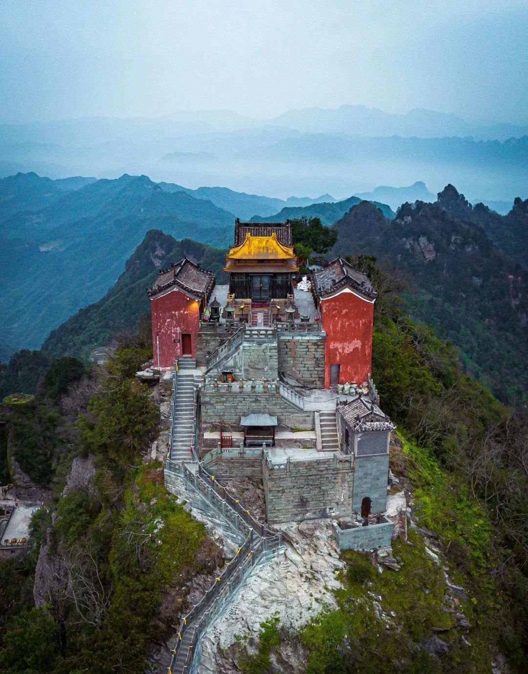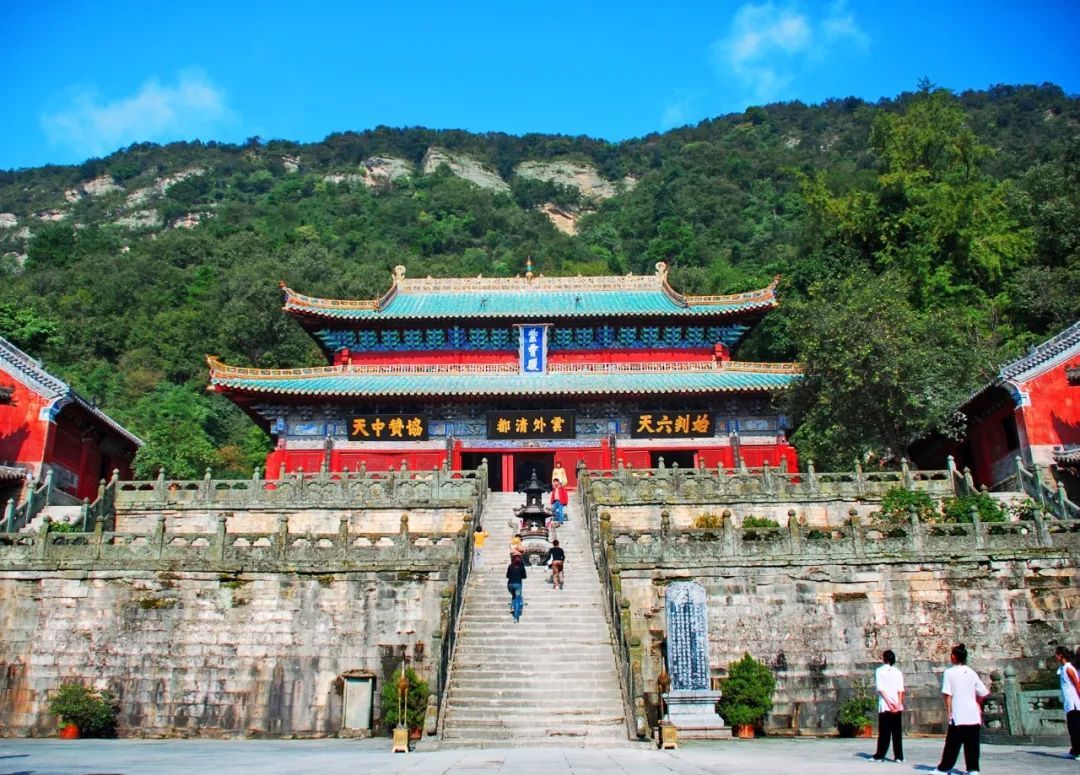 During the Ming Dynasty, in Wudang Mountain spanning an area of 800 square miles, the 33 complexes, such as 9 palaces, 8 temples, 36 monasteries, 72 rock temples, 39 bridges, and 12 pavilions, formed a magnificent landscape featuring "one monastery every five miles and one palace every ten miles, each with exquisite red walls and green tiles."