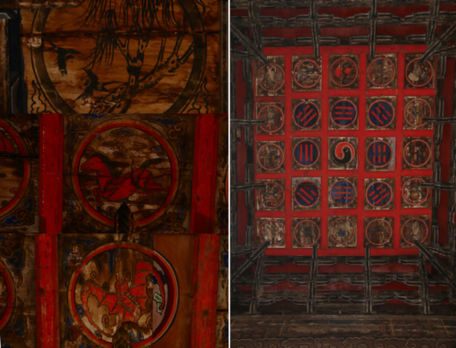 殿內(nèi)額坊、斗拱、天花,均繪有彩色圖案,藻井上浮雕二龍戲珠,36根杉木巨柱頂立其間,整座建筑,飛金流碧,盡顯雍容祥和之氣。