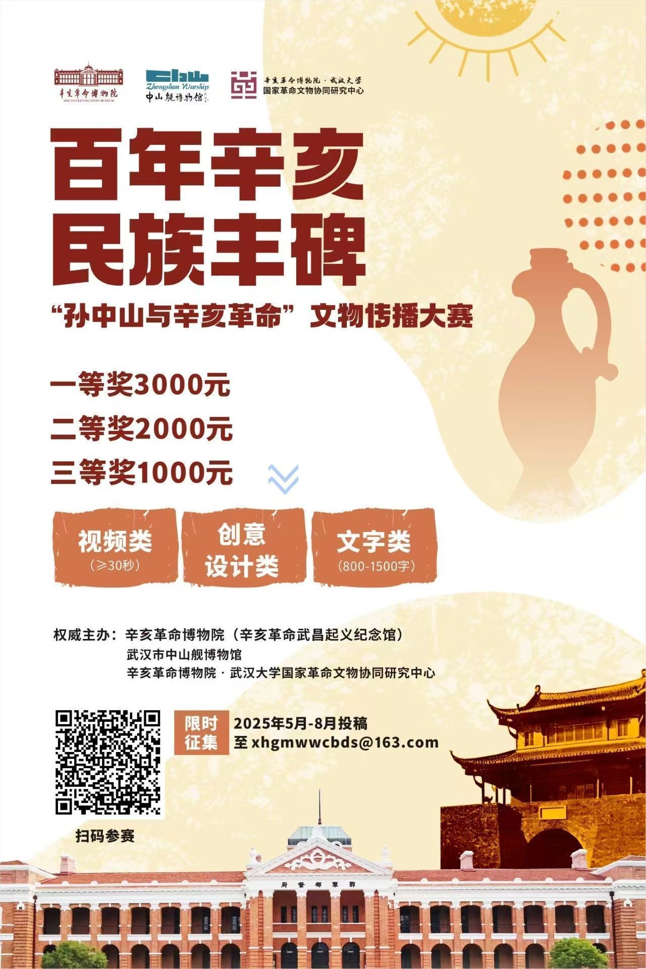 投稿請發(fā)送至指定郵箱 xhgmwwcbds@163.com,郵件標(biāo)題需按【辛亥革命文物傳播作品征集】類別 + 姓名(集體名)+ 參賽作品標(biāo)題規(guī)范填寫,內(nèi)容備注聯(lián)系方式。