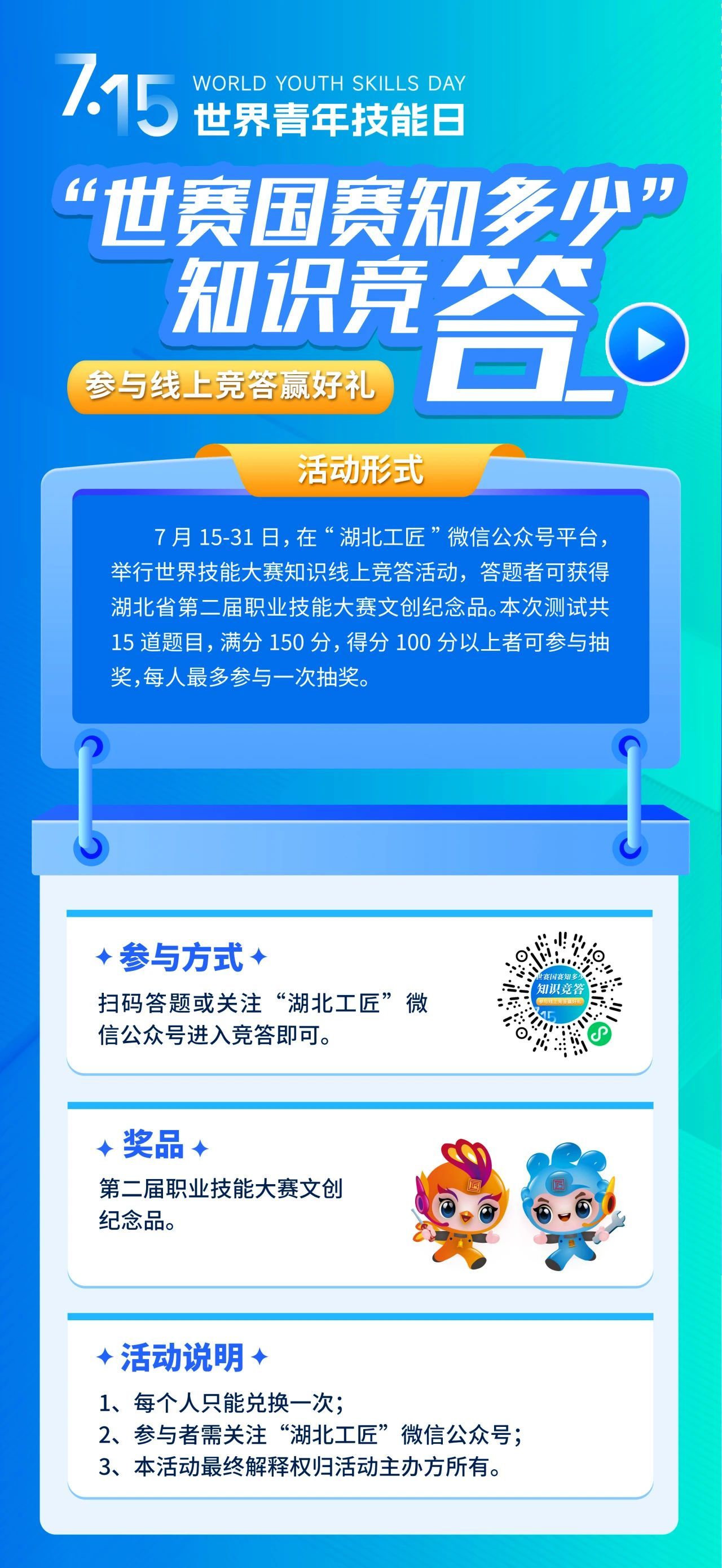 世界技能大賽和全國技能大賽知識線上競答火熱上線,微信掃描活動二維碼進入答題小程序。完成15道題并得分≥100分,即可抽取湖北省第二屆職業(yè)技能大賽限量版文創(chuàng)紀念品,每人限答一次,越早參與中獎率越高!