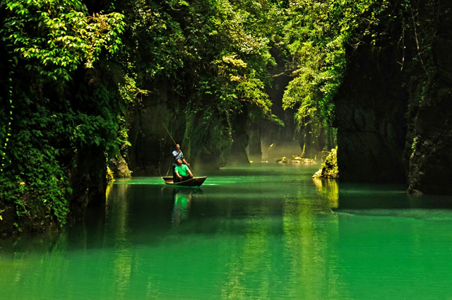 嘉賓們乘“地心奇航”方舟行于翠色江水 攝影 吳冰