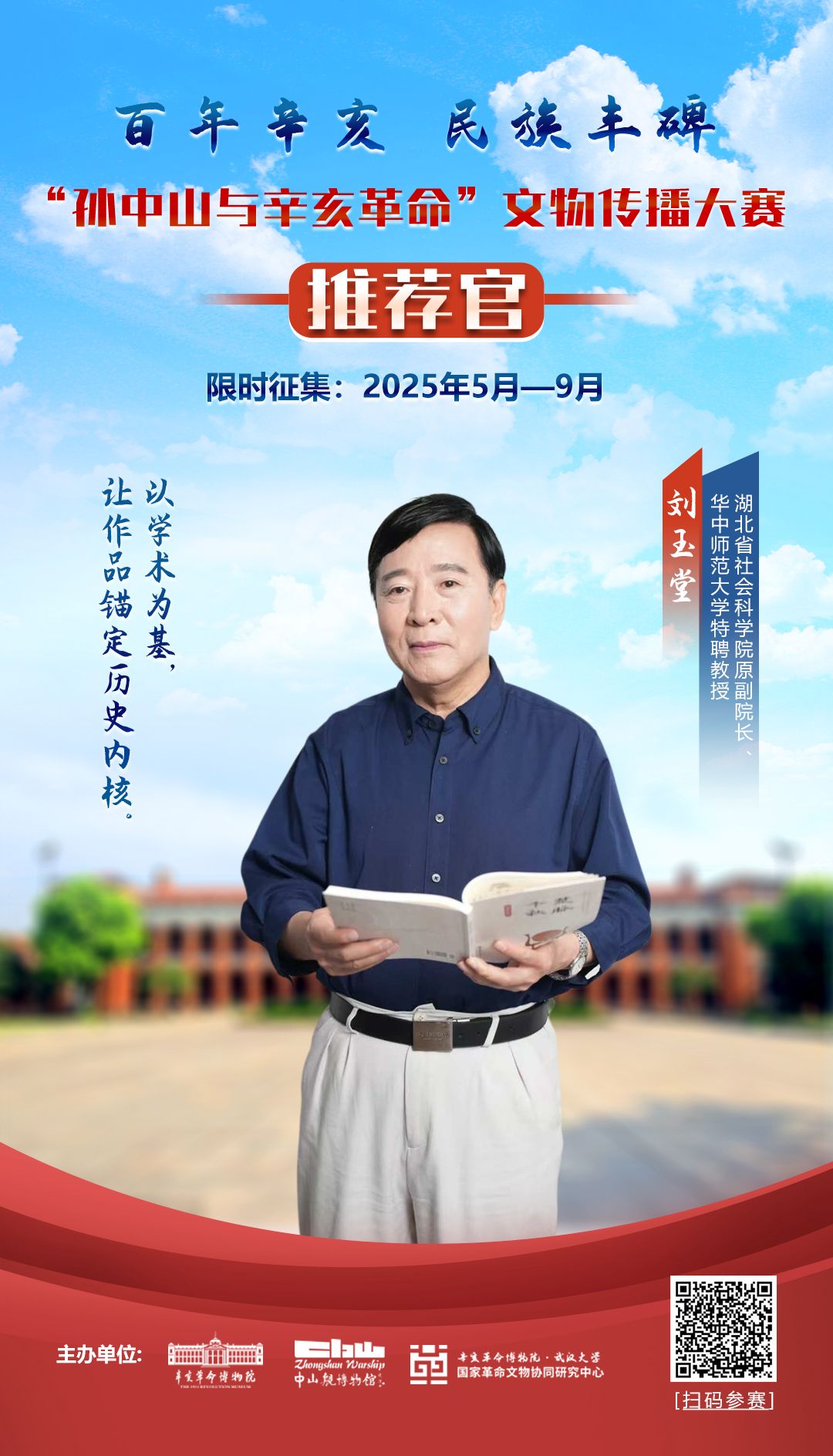 作為湖北省社會科學(xué)院原副院長、華中師范大學(xué)特聘教授,劉玉堂教授深耕歷史領(lǐng)域數(shù)十載。作為評委,他將以深厚的學(xué)術(shù)積淀為評審標(biāo)準(zhǔn),從文物的歷史語境出發(fā),審視作品是否精準(zhǔn)提煉辛亥志士的革命精神內(nèi)核、是否具備歷史厚重感與說服力。