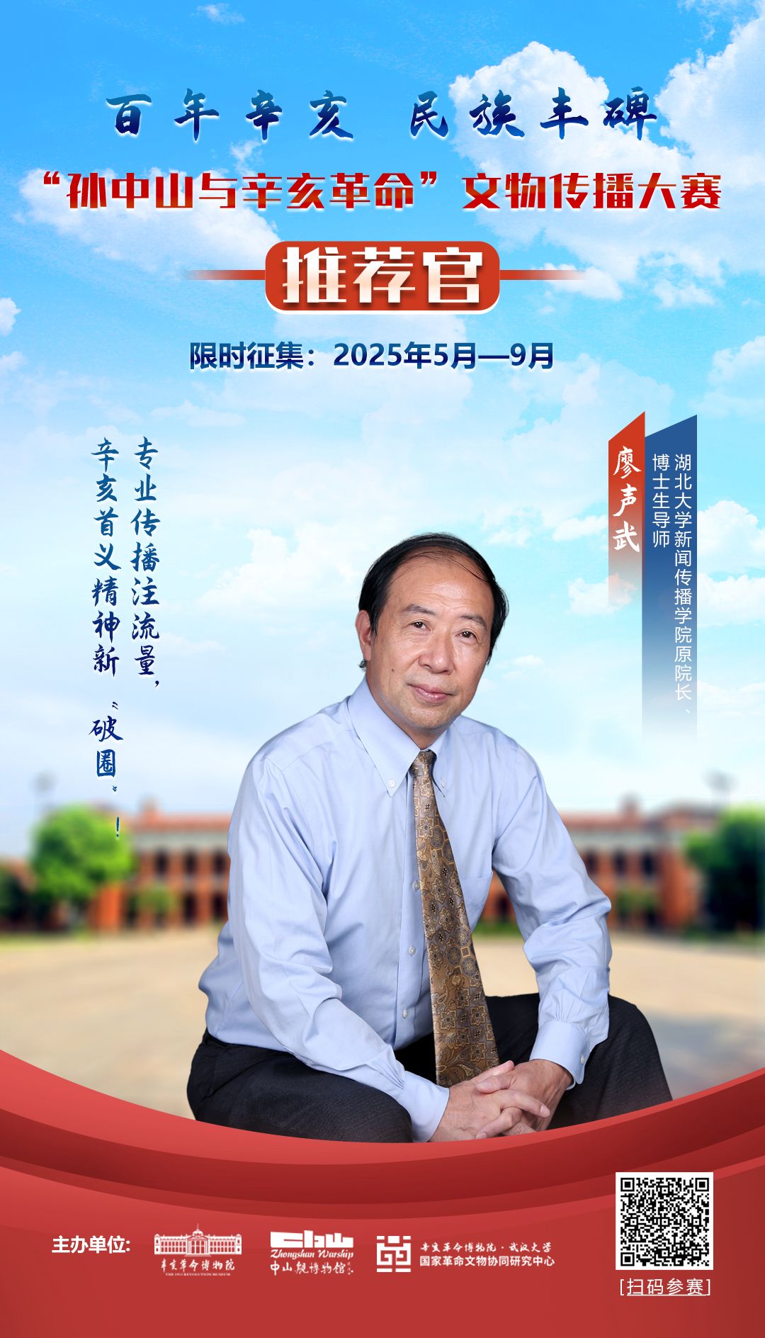 湖北大學(xué)新聞傳播學(xué)院原院長廖聲武教授,深諳傳播之道。作為評委,他將從傳播邏輯、表達(dá)形式等角度評審:作品是否用大眾能理解、愿接受的方式講述歷史,作品是否具備“破圈”潛力,讓辛亥首義精神被更廣泛的群體看見、記住。