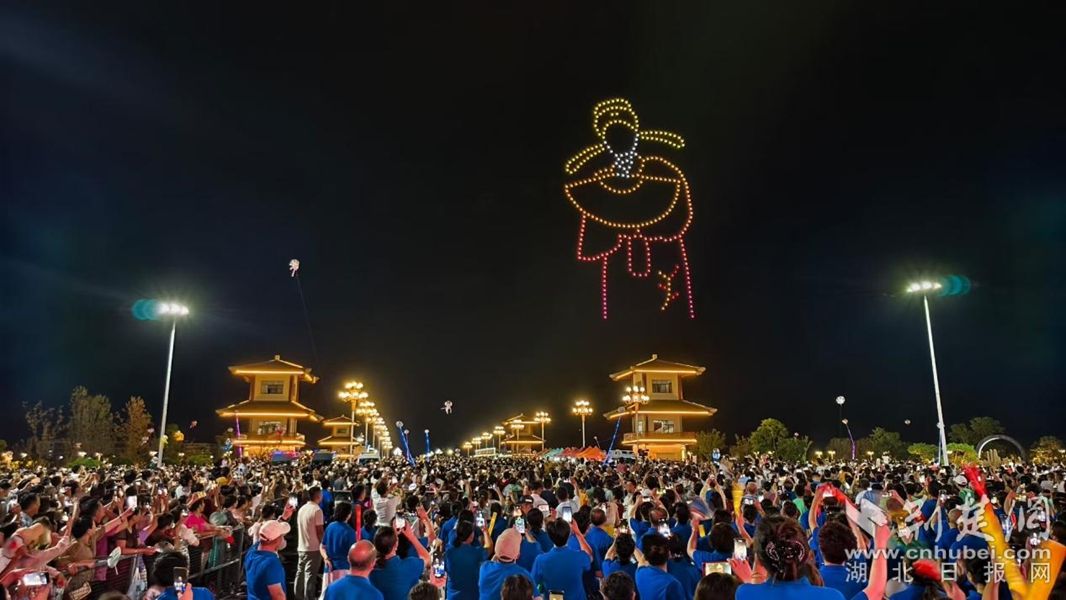 夜幕中,三百架無人機騰空而起,伴隨著悠揚的黃梅調,在天空中次第變幻出黃梅戲服、“莫錯過”字樣等立體光影圖案,與兩岸璀璨燈光交織成一幅科技與藝術深度融合的絢麗畫卷,引來觀眾驚嘆連連。