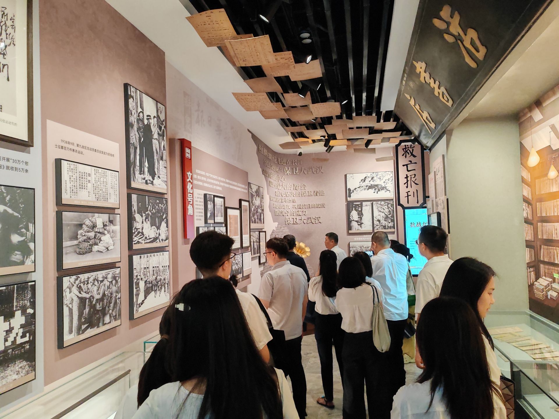 為讓觀眾 “穿越” 回1938年的武漢,展覽運(yùn)用多媒體技術(shù)打造多個(gè)沉浸式場(chǎng)景。在 “武漢七七獻(xiàn)金運(yùn)動(dòng)” 展區(qū),復(fù)原的街頭獻(xiàn)金臺(tái)與手持撲滿的小女孩形象,搭配多媒體聯(lián)動(dòng)屏,重現(xiàn)不同群體踴躍獻(xiàn)金的愛(ài)國(guó)場(chǎng)景,觀眾還可參與互動(dòng)生成專屬 “獻(xiàn)金證書(shū)”;毛澤東《論持久戰(zhàn)》創(chuàng)作場(chǎng)景以投影剪影結(jié)合窯洞塑形,還原毛主席在延安撰寫(xiě)著作的場(chǎng)景,同時(shí)通過(guò)逐筆書(shū)法技術(shù),突出 “兵民是勝利之本” 等經(jīng)典名句,讓理論著作更易被理解。