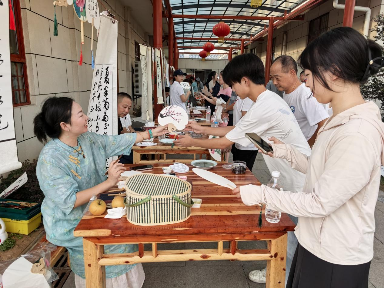 采摘季的熱鬧,不止在葡萄架下。園區(qū)內(nèi)的文化活動區(qū),扇子繪畫與書法桌前圍滿了人。老師們凝神揮毫,有的在扇面勾勒黛色遠山、粉紅梅花,有的書寫“喜樂安康”“清風徐來”,圍觀群眾有序排隊,盼著領(lǐng)走專屬自己的“文化伴手禮”。