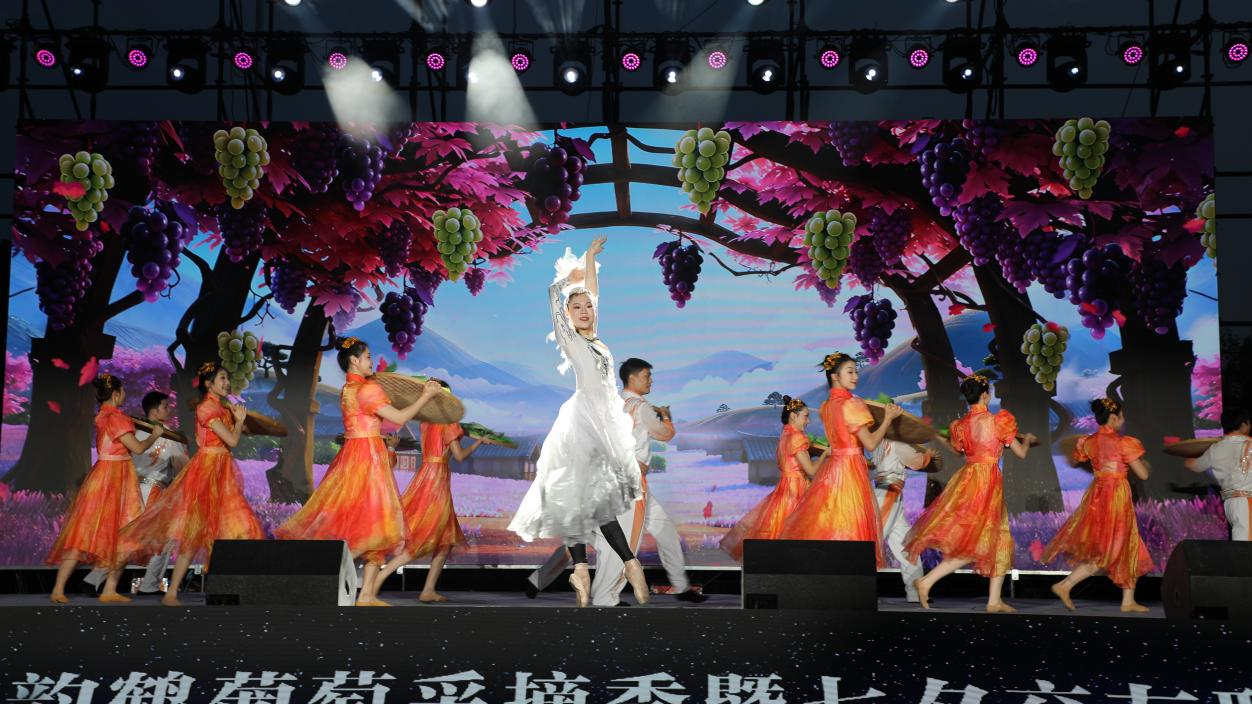 夜幕降臨,采摘季主題晚會如期上演。湖北省歌劇舞劇院帶來的《鶴舞云天?歡聚葡園》驚艷全場,小品、魔術(shù)、抽獎互動環(huán)節(jié)接連登場,歌唱家獻唱經(jīng)典曲目,現(xiàn)場氛圍熱烈。情景講述《仙鶴歸來是故鄉(xiāng)》更是生動再現(xiàn)了黃灼初返鄉(xiāng)創(chuàng)業(yè)的艱辛與溫暖。