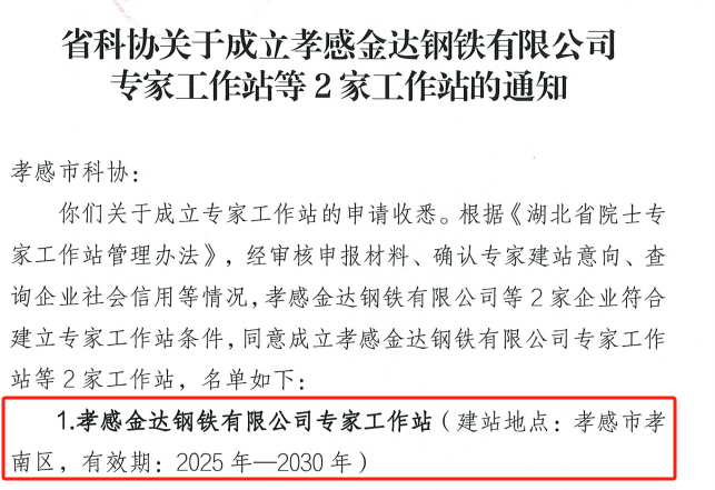 荊楚網(wǎng)(湖北日?qǐng)?bào)網(wǎng))訊(通訊員 陳娟)近日,湖北省科協(xié)公布了《省科協(xié)關(guān)于成立孝感金達(dá)鋼鐵有限公司專家工作站等2家工作站的通知》,孝感金達(dá)鋼鐵有限公司專家工作站正式獲批成立,為孝南區(qū)首家與外籍院士共建的專家工作站。