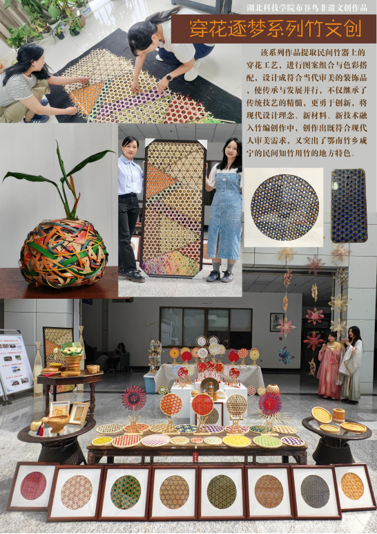 跨專業(yè)團(tuán)隊(duì)覆蓋設(shè)計(jì)、教育、傳播等領(lǐng)域,形成研發(fā)-推廣-銷售全鏈條。近年獲7項(xiàng)國(guó)家級(jí)/省級(jí)創(chuàng)業(yè)項(xiàng)目、17項(xiàng)專利、50余項(xiàng)學(xué)科競(jìng)賽獎(jiǎng),2023年入選教育部傳統(tǒng)文化宣傳項(xiàng)目,2024年斬獲湖北省大學(xué)生藝術(shù)節(jié)二等獎(jiǎng)并亮相開幕展演,現(xiàn)場(chǎng)打造的“湖科大藝圓”竹編裝置獲專家贊譽(yù)。