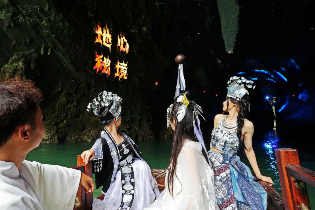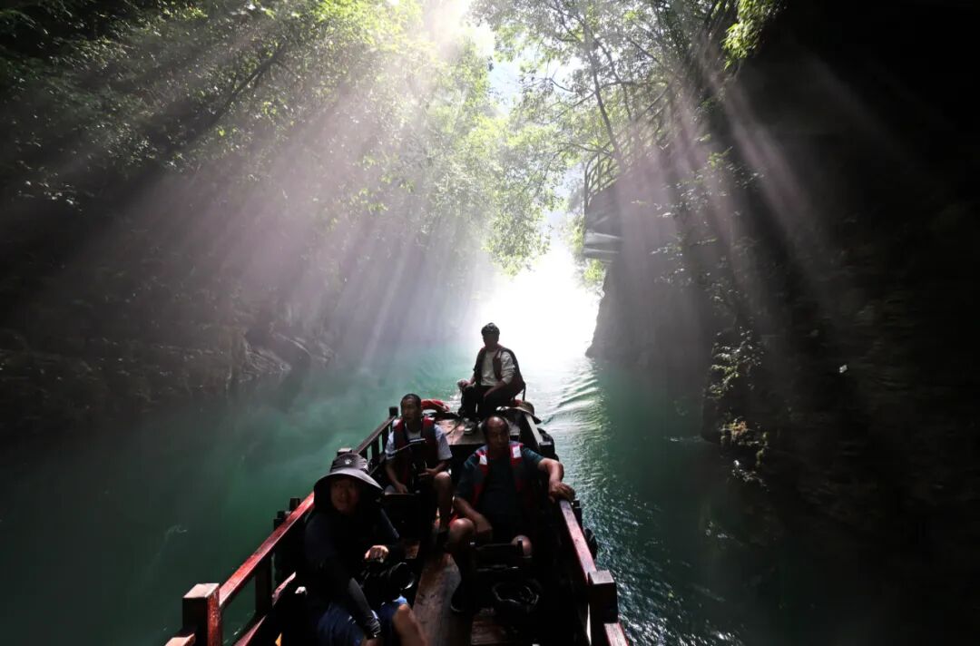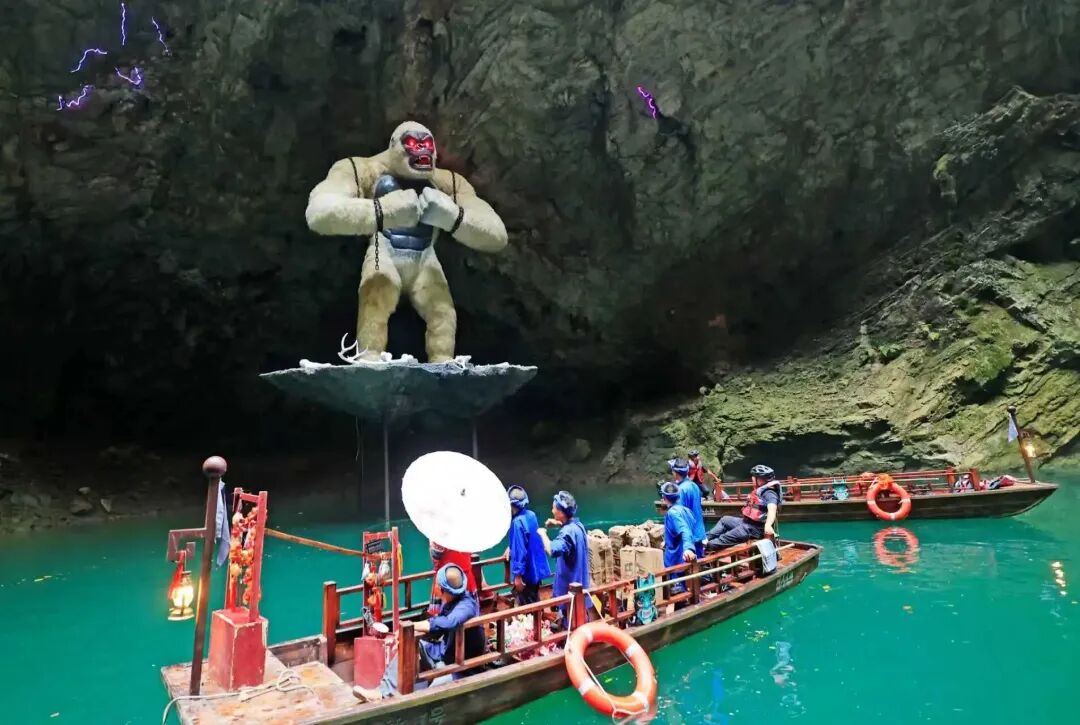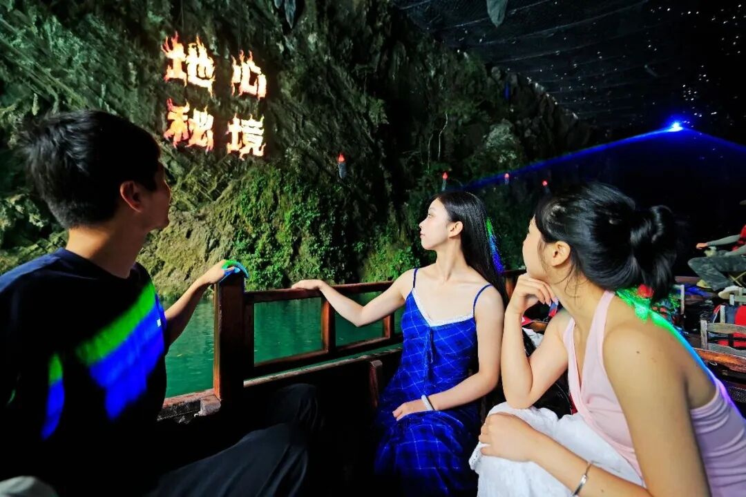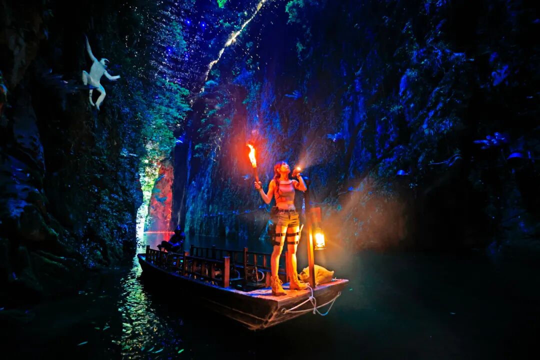船只駛?cè)胗纳畹牡叵潞拥溃瑳鏊瑲庀涿娑鴣?lái)。七彩燈光投射在千年崖壁上,打造出如夢(mèng)似幻的氛圍。在蜿蜒曲折的地下迷宮中穿行,每一次轉(zhuǎn)彎都可能遇見(jiàn)震撼的地質(zhì)奇觀。