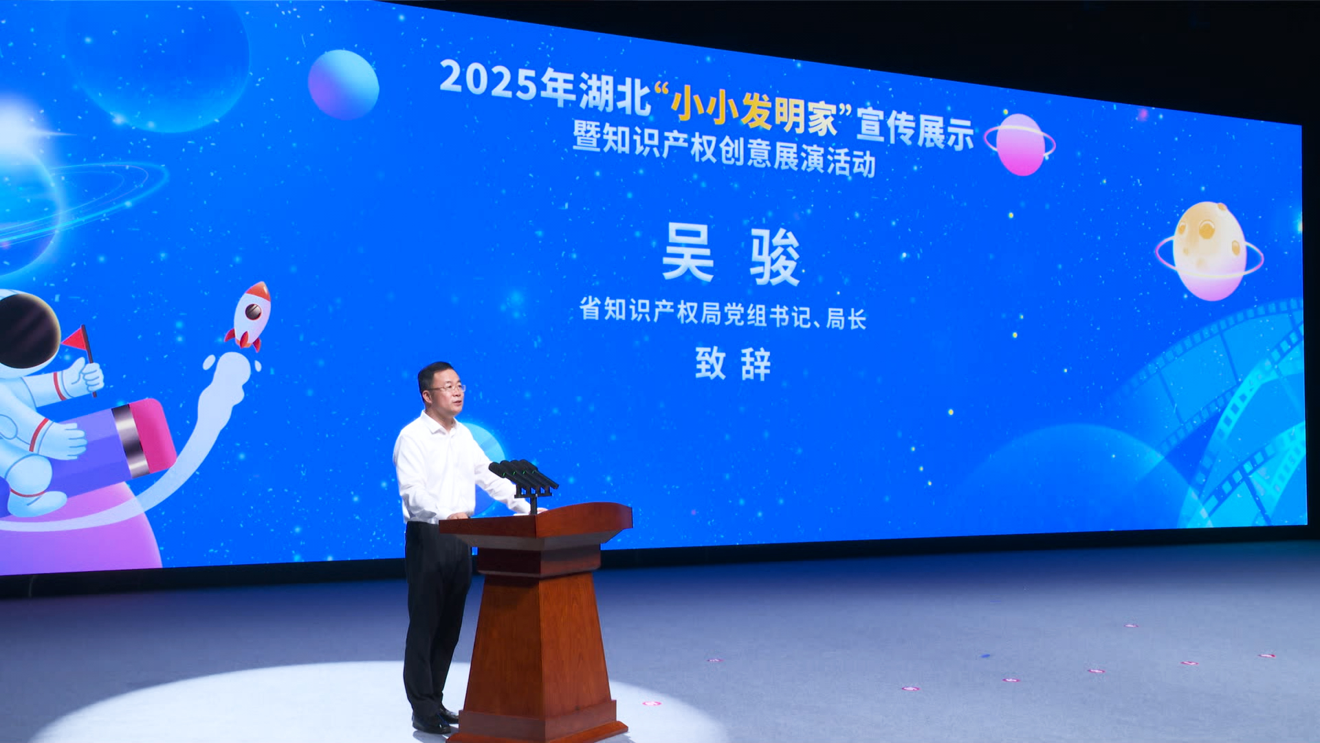 活動(dòng)在武漢市光谷第二十一小學(xué)樂隊(duì)和機(jī)器人共同帶來的開場秀《閃耀明天》中拉開帷幕。湖北省知識(shí)產(chǎn)權(quán)局黨組書記、局長吳駿致辭表示,此次活動(dòng)旨在為全省熱愛科學(xué)、勇于創(chuàng)新的青少年們搭建一個(gè)激發(fā)靈感、展示才華、交流互鑒的廣闊平臺(tái),讓創(chuàng)新的種子在幼小的心靈中生根發(fā)芽,讓知識(shí)產(chǎn)權(quán)的理念在青春的土壤里茁壯成長。他親切寄語“小小發(fā)明家”,永葆好奇之心,敢于提問,善于思考,勤于動(dòng)手,將天馬行空的想象變成創(chuàng)新創(chuàng)造的作品;初識(shí)知識(shí)產(chǎn)權(quán),了解它、尊重它、運(yùn)用它,學(xué)會(huì)保護(hù)創(chuàng)意,尊重發(fā)明創(chuàng)造;同時(shí)志存高遠(yuǎn),將今天的興趣發(fā)展成為明天的志向,努力成長為科技自立自強(qiáng)的棟梁之材。