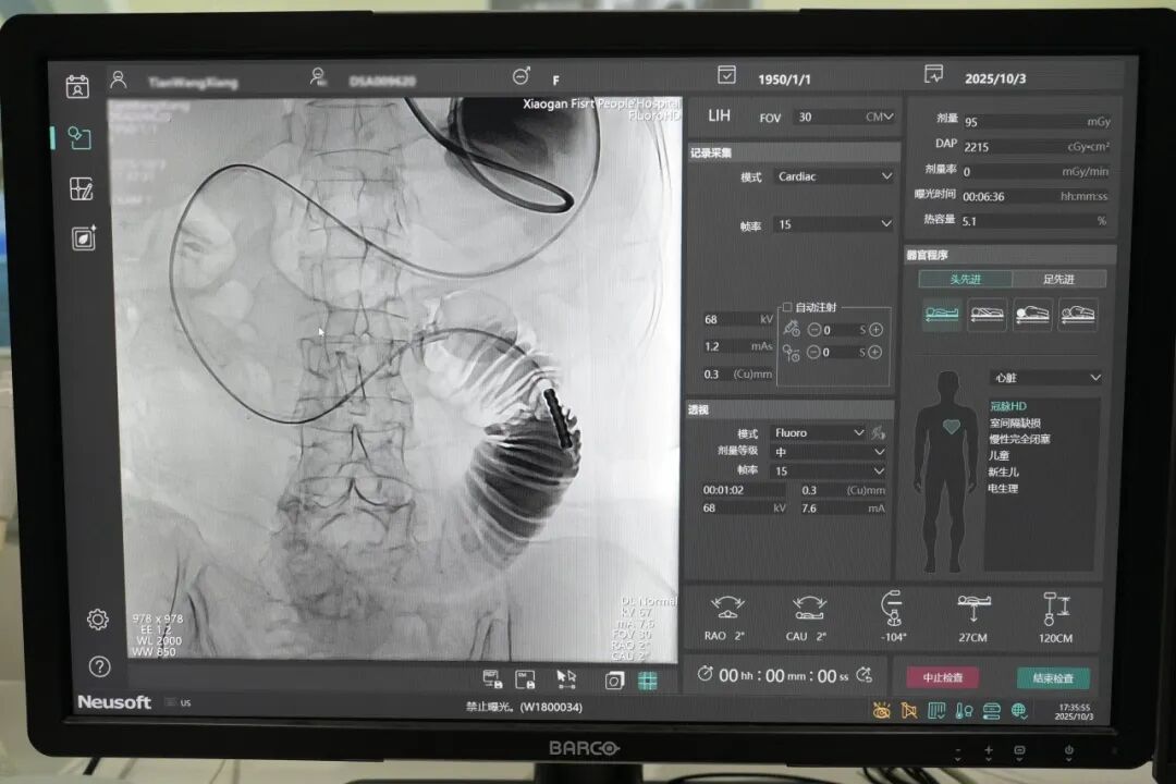 為盡快解除患者痛苦,黃遷祥主任及其團(tuán)隊(duì)毅然放棄節(jié)假日休息。手術(shù)當(dāng)日,在清晰的影像引導(dǎo)下,黃遷祥憑借嫻熟的技術(shù)和豐富的經(jīng)驗(yàn),精準(zhǔn)地將一根3米長(zhǎng)的腸梗阻導(dǎo)管經(jīng)鼻腔置入,并成功引導(dǎo)其通過(guò)幽門(mén)、十二指腸,直達(dá)梗阻近端的腸腔內(nèi)。整個(gè)過(guò)程猶如在消化道迷宮中完成了一次精準(zhǔn)的“穿針引線(xiàn)”。該導(dǎo)管能在腸蠕動(dòng)及重力的共同作用下,在小腸內(nèi)不斷前進(jìn),持續(xù)吸引梗阻近端的液體和氣體,從而迅速改善患者腹痛、腹脹的癥狀,減輕腸腔壓力和腸壁水腫,緩解梗阻癥狀。