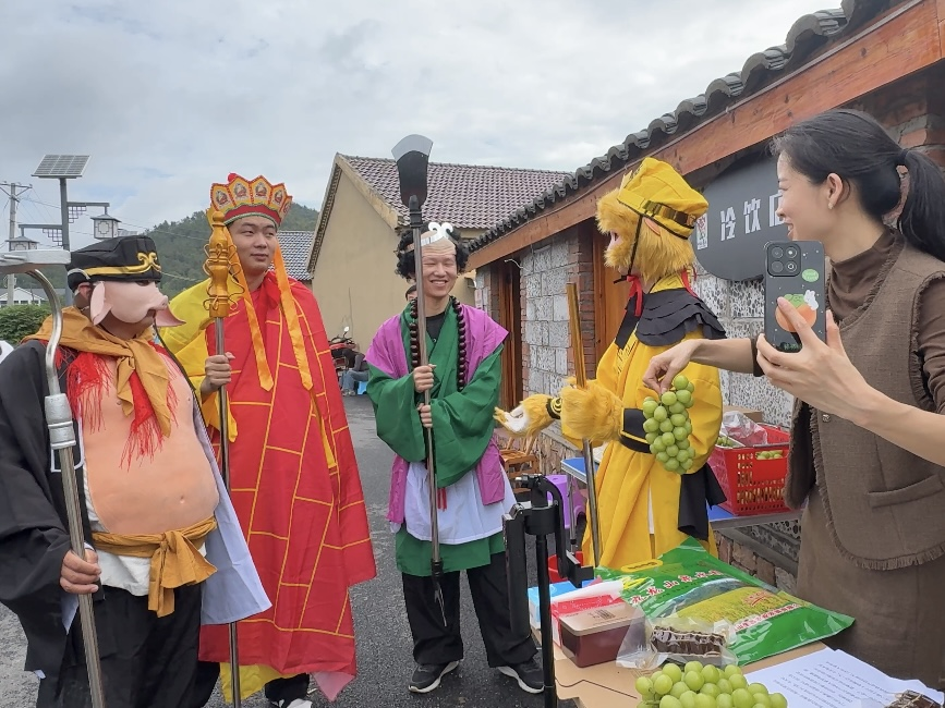 為了增添活動(dòng)的趣味性和傳播力,鎮(zhèn)黨委、政府特別安排了志愿者扮演唐僧師徒四人,作為推薦官在直播間為大家推薦各類好物,吸引了不少粉絲進(jìn)到直播間。隨后,還沿著林澗小隱、魚(yú)鱗壩巡展,與村民互動(dòng),不僅為展銷會(huì)增添了歡聲笑語(yǔ),也讓鄉(xiāng)村振興的理念以更生動(dòng)的方式深入人心。