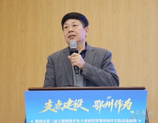 頒獎活動現(xiàn)場,湖北省社會科學(xué)院原副院長、省政府咨詢委員、長江經(jīng)濟帶智庫聯(lián)盟秘書長秦尊文受邀出席,并從網(wǎng)評的角度,圍繞“弘揚花湖精神 助力支點建設(shè)”主題,發(fā)表了主旨演講。他結(jié)合最新公布的《中共中央關(guān)于制定國民經(jīng)濟和社會發(fā)展第十五個五年規(guī)劃的建議》,高屋建瓴分析了鄂州當(dāng)前的經(jīng)濟形勢,提出了切實可行的建議。湖北省委直屬機關(guān)工委干部馮歡以中央網(wǎng)信辦網(wǎng)絡(luò)評論“創(chuàng)四優(yōu)”競賽獲獎作者身份,分享了自己多年網(wǎng)評文章寫作的心得體會,風(fēng)趣幽默、干貨滿滿。