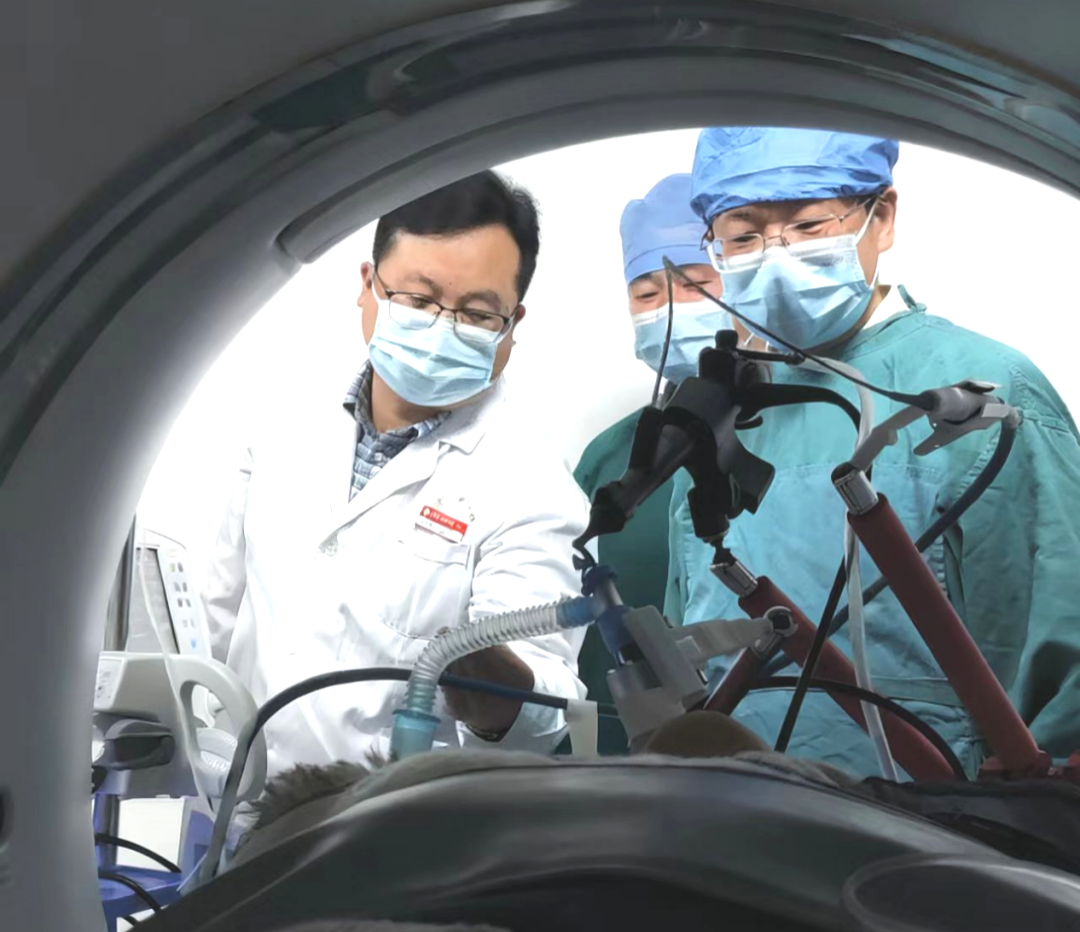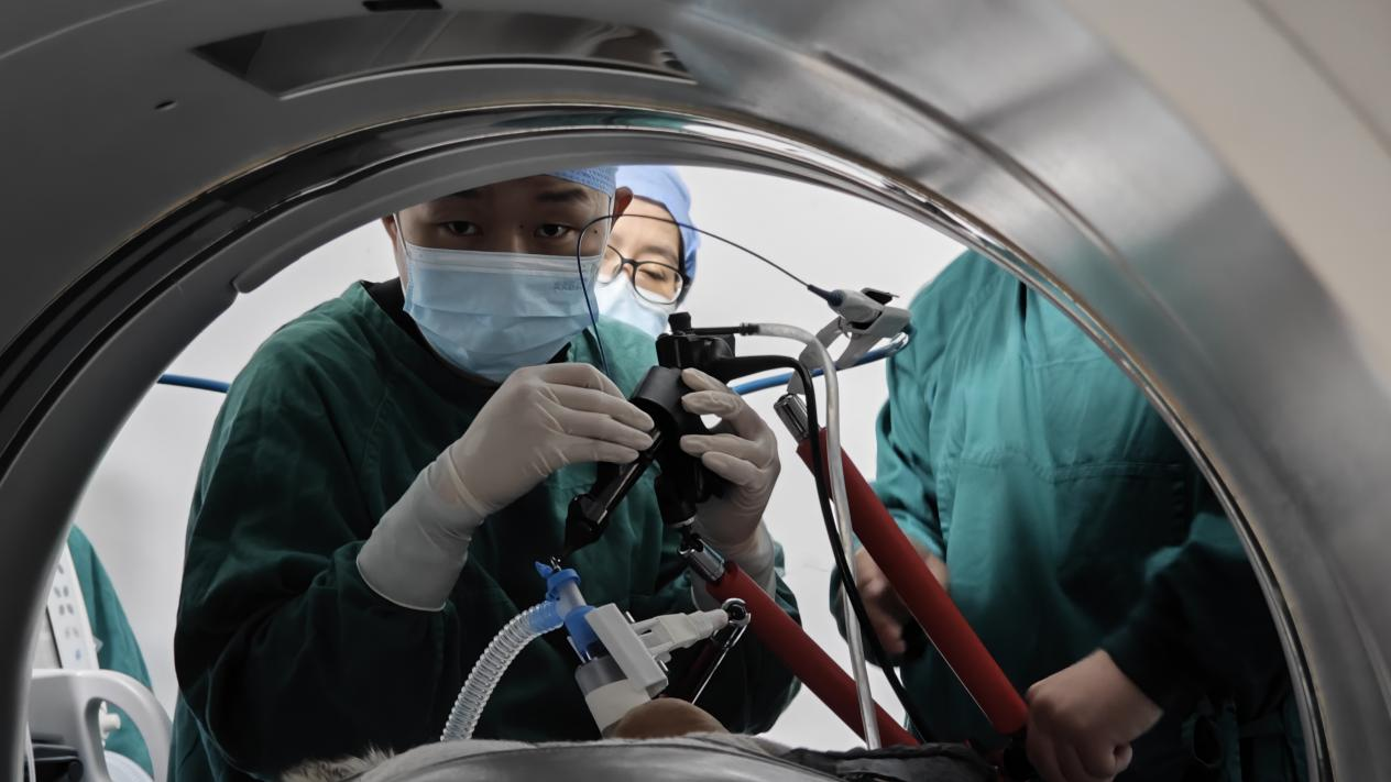 在AI+AR導(dǎo)航引導(dǎo)下,團隊于患者目標肺段支氣管用徑向超聲探查到實性低回聲區(qū)域,隨后通過支氣管鏡擴張導(dǎo)管引導(dǎo)冷凍消融探頭至目標位置。經(jīng)局部CT掃描確認定位精準后,采用“冷凍10分鐘、復(fù)溫2分鐘”的循環(huán)模式,術(shù)中最低溫度達零下156℃,最高溫度50℃,共計四個循環(huán)冷凍消融處理,復(fù)查胸部CT消融范圍基本達到預(yù)期。整個手術(shù)過程中,患者生命體征平穩(wěn),未出現(xiàn)并發(fā)癥。術(shù)后經(jīng)短期觀察,兩名患者恢復(fù)良好,均順利出院。