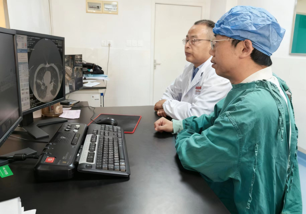 針對兩名患者的復(fù)雜病情,醫(yī)院啟動MDT多學(xué)科聯(lián)合診療機制。放射影像科、核醫(yī)學(xué)科、疼痛科、胸外科、腫瘤科等多學(xué)科專家共同研討,呼吸與危重癥醫(yī)學(xué)科劉鈞副主任醫(yī)師、邱琦主治醫(yī)師等反復(fù)評估患者病情,經(jīng)與家屬充分溝通后,最終決定采用AI+AR光學(xué)導(dǎo)航支氣管鏡聯(lián)合徑向超聲引導(dǎo)下的冷凍消融術(shù),在精準作用于病灶的同時,最大程度保護患者肺功能。