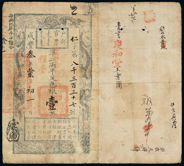 咸豐三年戶部官票壹兩一枚,仁字第八千三百三十七號,正面加蓋“十一年春季改發(fā)江北”、“糧臺”及墨戳小花押,圖源首席收藏