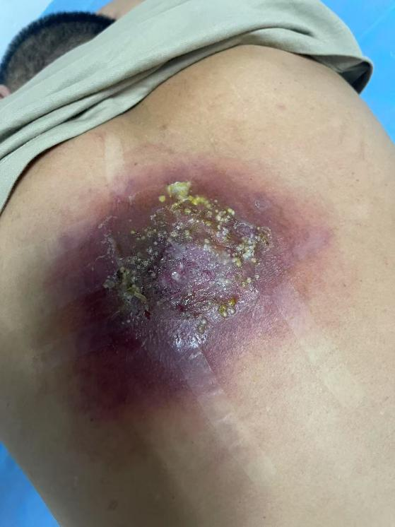 2025年10月,在三亞務(wù)工的王先生背部突然出現(xiàn)包塊,隨即發(fā)展為紅腫破潰,伴隨劇烈疼痛。盡管在當(dāng)?shù)蒯t(yī)院接受了12天治療,病情卻持續(xù)惡化:創(chuàng)面不斷擴大,還出現(xiàn)全身乏力、精神萎靡等癥狀。意識到情況危急,他毅然決定轉(zhuǎn)回家鄉(xiāng)孝感市中心醫(yī)院尋求治療。